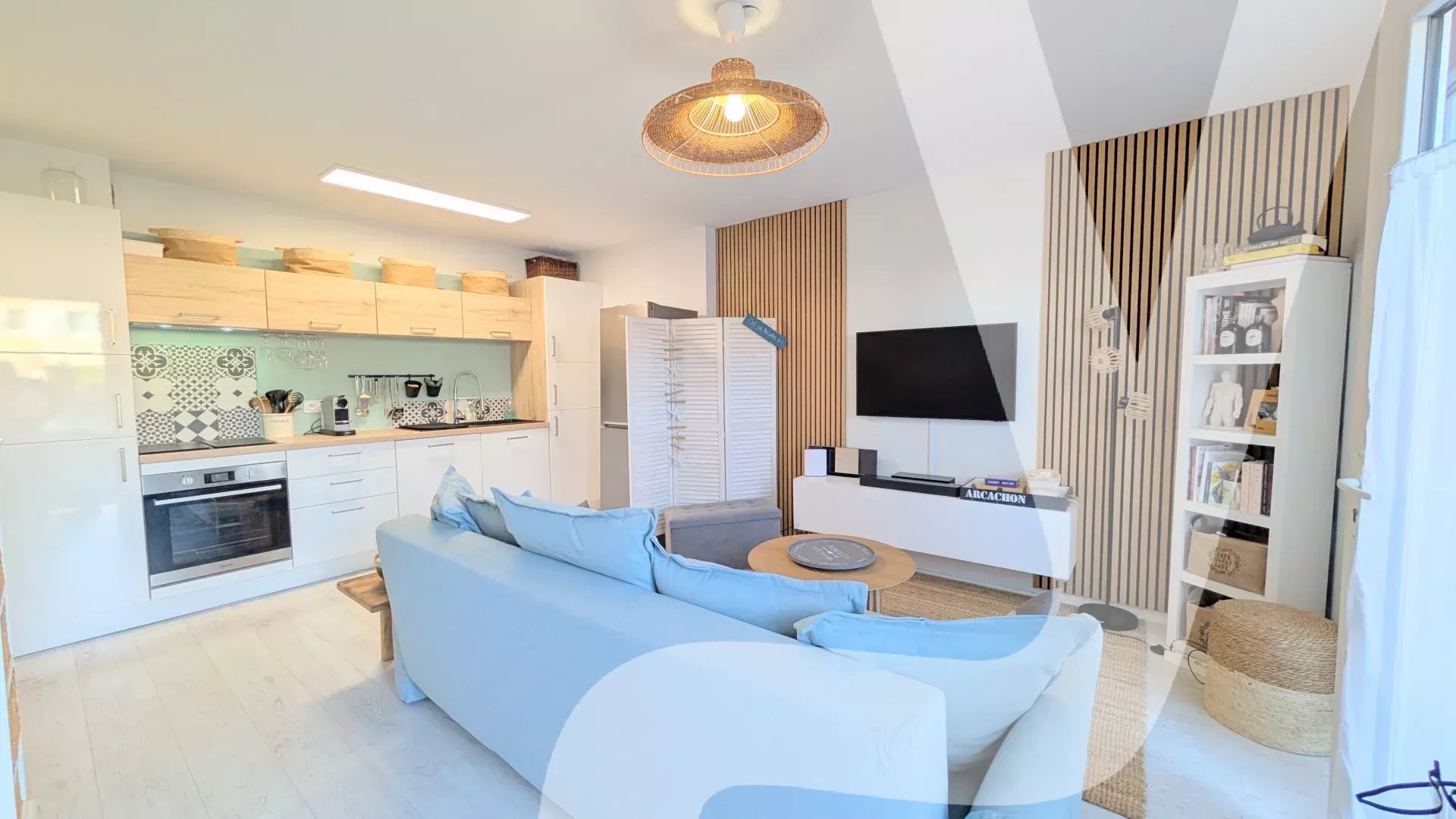 Salon lumineux avec cuisine équipée ouverte
