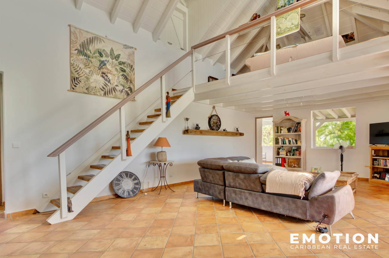 - d'un séjour lumineux avec double exposition de 38 m2 donnant sur la terrasse couverte, d'une cuisine aménagée et équipée de 13 m2 semi ouverte, un bureau en mezzanine de 18 m2, une suite comprenant une chambre climatisée avec accès sur la terrasse, son dressing et sa salle de bain privative de 29 m2, une seconde chambre de 11 m2 et une troisième chambre climatisée de 11 m2 avec sa salle de douche privative de 6 m2 et toilettes.