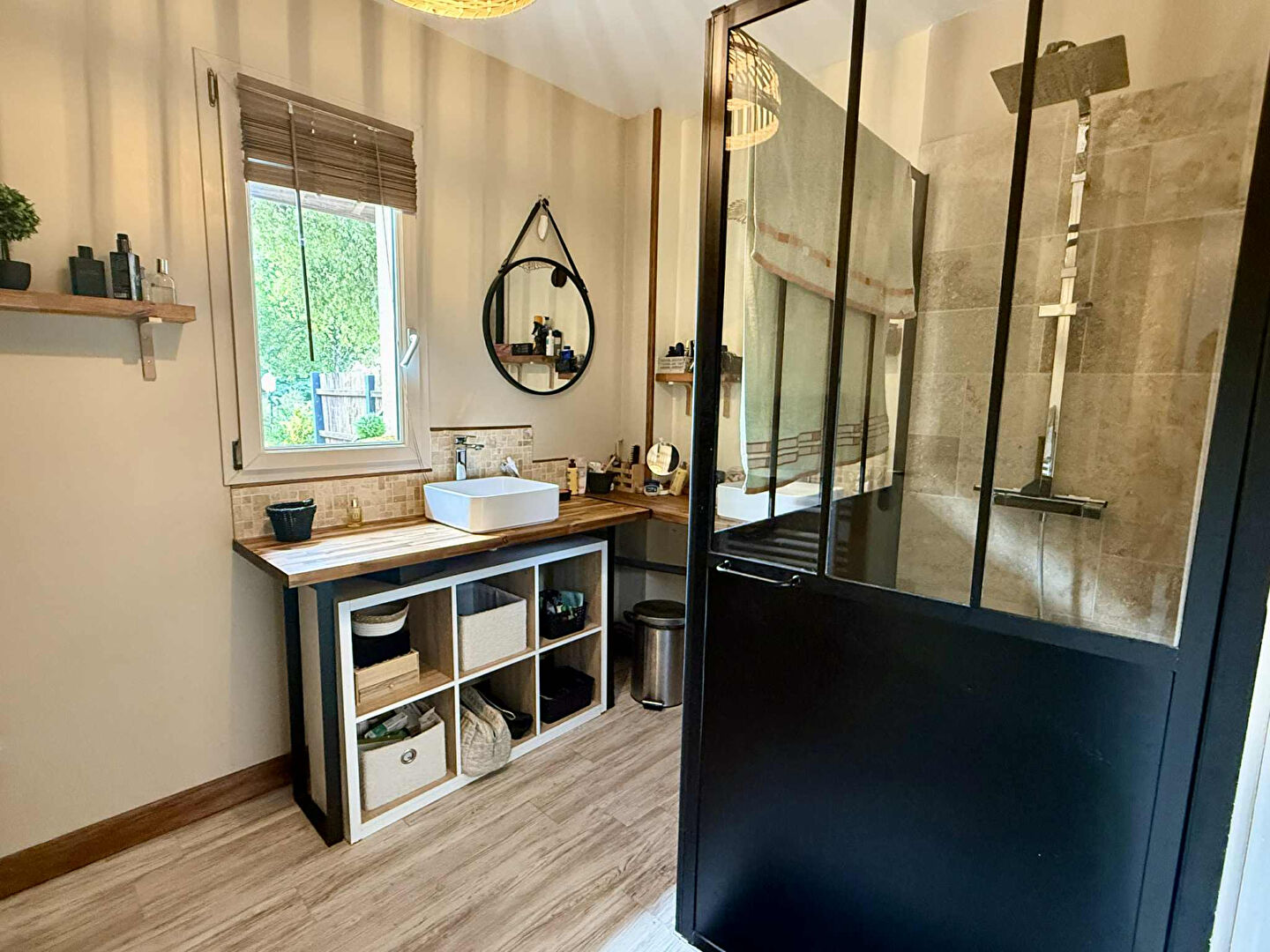 Avec ses 128 m² habitables, elle offre un cadre de vie paisible sur un terrain clos, arboré et paysagé de 2 596 m². Elle se compose de quatre chambres, d'un séjour salon chaleureux, d'une cuisine aménagée et équipée ouverte sur une belle terrasse en bois, ainsi que de deux salles d'eau et deux WC.