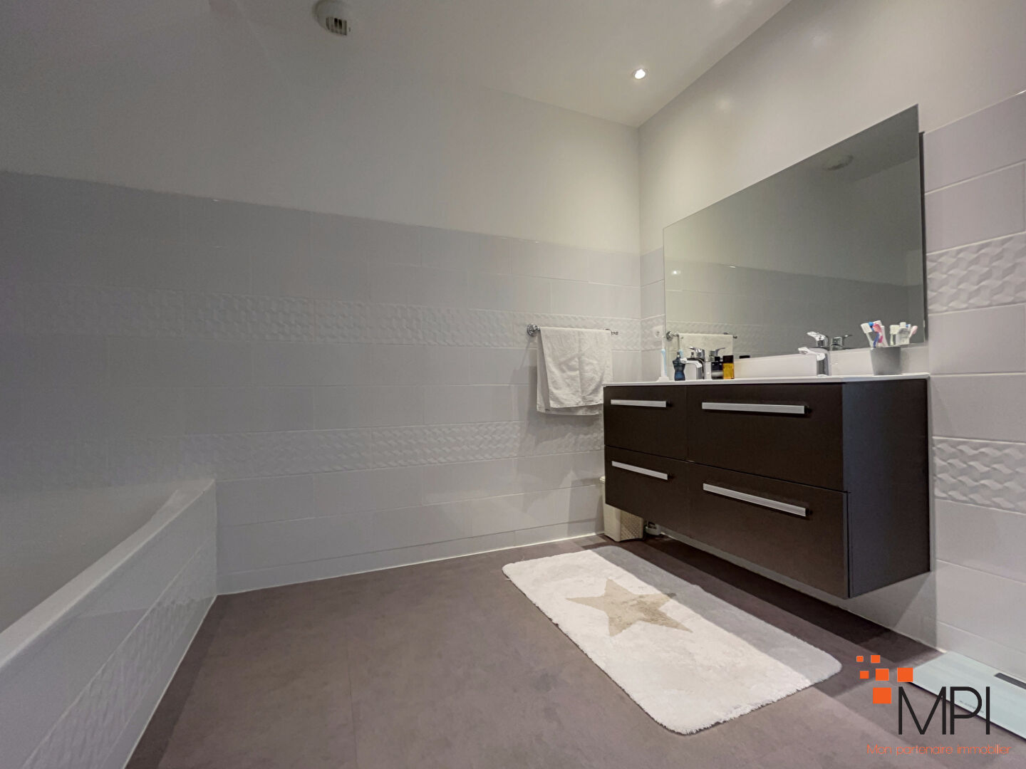 Édifiée sur une parcelle de 407 m² exposée plein Sud, elle développe une surface de 145 m². Au rez-de-chaussée, vous découvrirez un salon-séjour de près de 38 m², extrêmement lumineux grâce à sa double exposition Sud et Est, intégrant l'entrée et l'escalier. Une cuisine aménagée et équipée de 15,5 m², avec coin cellier, complète cet espace de vie, ainsi qu'un WC suspendu avec lave-mains.