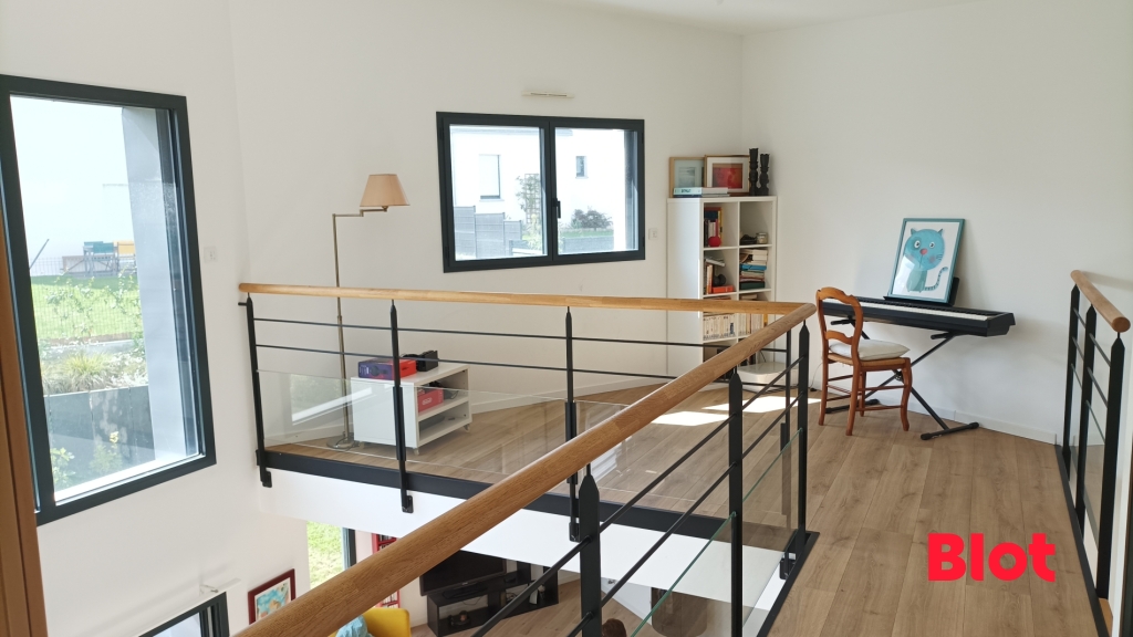 À l'étage, une vaste mezzanine pouvant accueillir un coin bureau offre une vue sur le séjour. Trois chambres spacieuses, dont deux avec placard, se partagent une salle de bains et un WC indépendant.