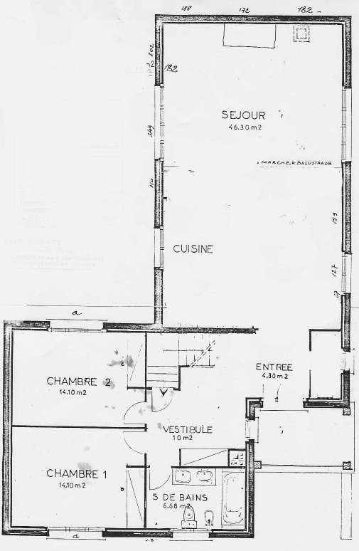 Premier étage : palier, grande chambre avec placards aménagés (cette chambre peut être divisée en deux, comme dans sa configuration d'origine), salle de bains, WC.