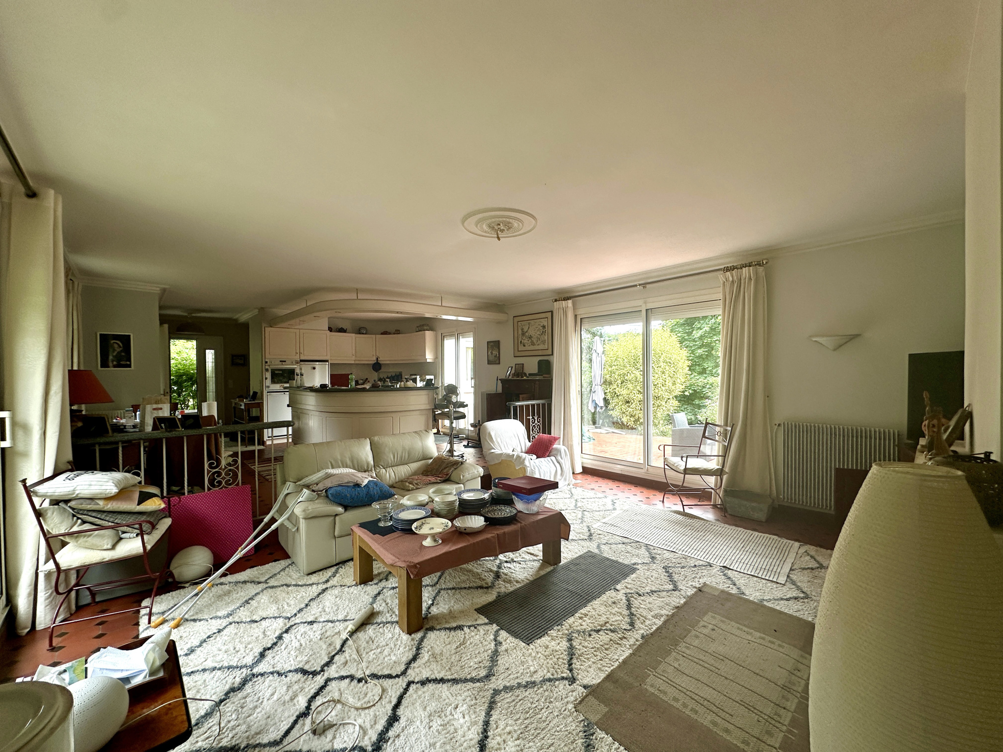 Pièce de vie lumineuse (double exposition et deux baies vitrées) de 46 m2 avec cuisine aménagée réalisée par un artisan-menuisier, s'ouvrant sur une grande terrasse carrelée, sans aucun vis-à-vis.