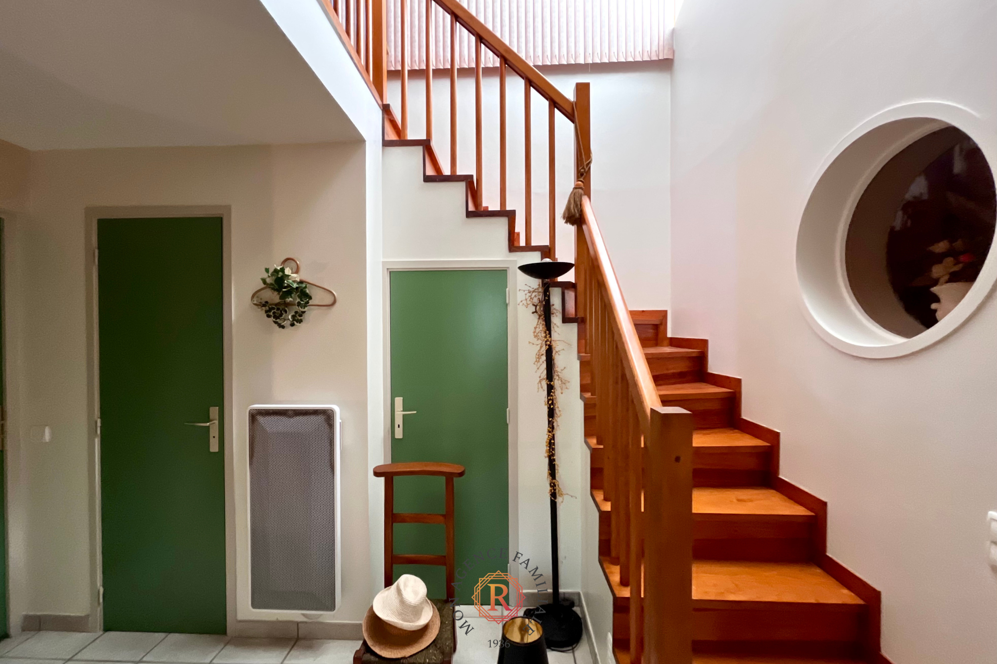 Au rez-de-chaussée, vous trouverez une entrée, une cuisine séparée, un salon/séjour lumineux, salle à manger, un bureau, deux chambres, une salle d'eau, un WC et 2 garages.