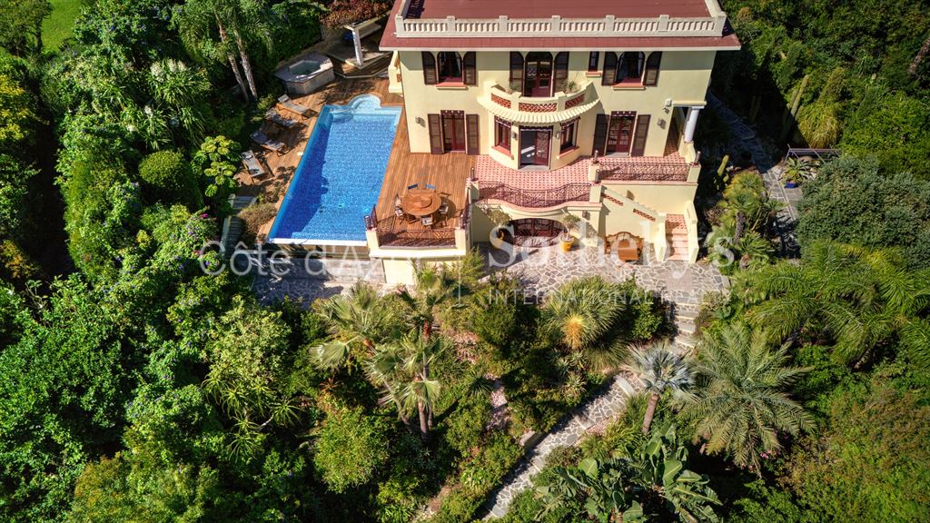 À l’extérieur, les jardins paysagers aux essences méditerranéennes entourent une piscine chauffée et un jacuzzi, tandis que de vastes terrasses panoramiques offrent une vue exceptionnelle sur les îles de Lérins, Palm Beach et le Cap d’Antibes. Un pool house et une cuisine d’été entièrement équipée complètent ce cadre d’exception. Deux garages sécurisés, un double et un simple, assurent un stationnement pratique.
