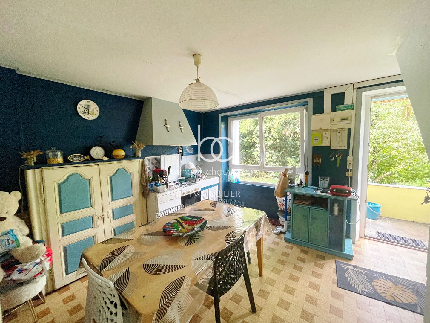 Actuellement, le rez-de-chaussée se compose d'une cuisine indépendante avec sa cheminée, d'un séjour sur parquet, d'un cellier/buanderie, d'une salle de bains et de WC.