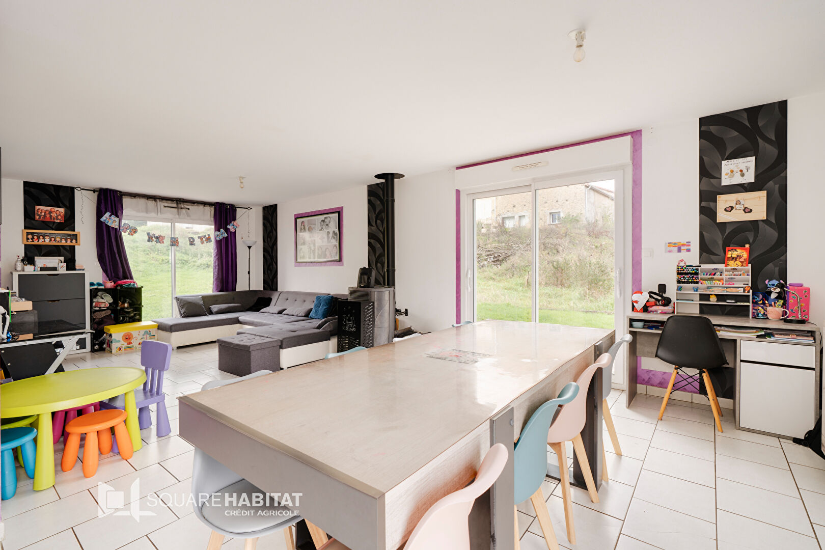 Une spacieuse pièce de vie lumineuse donnant accès au jardin,