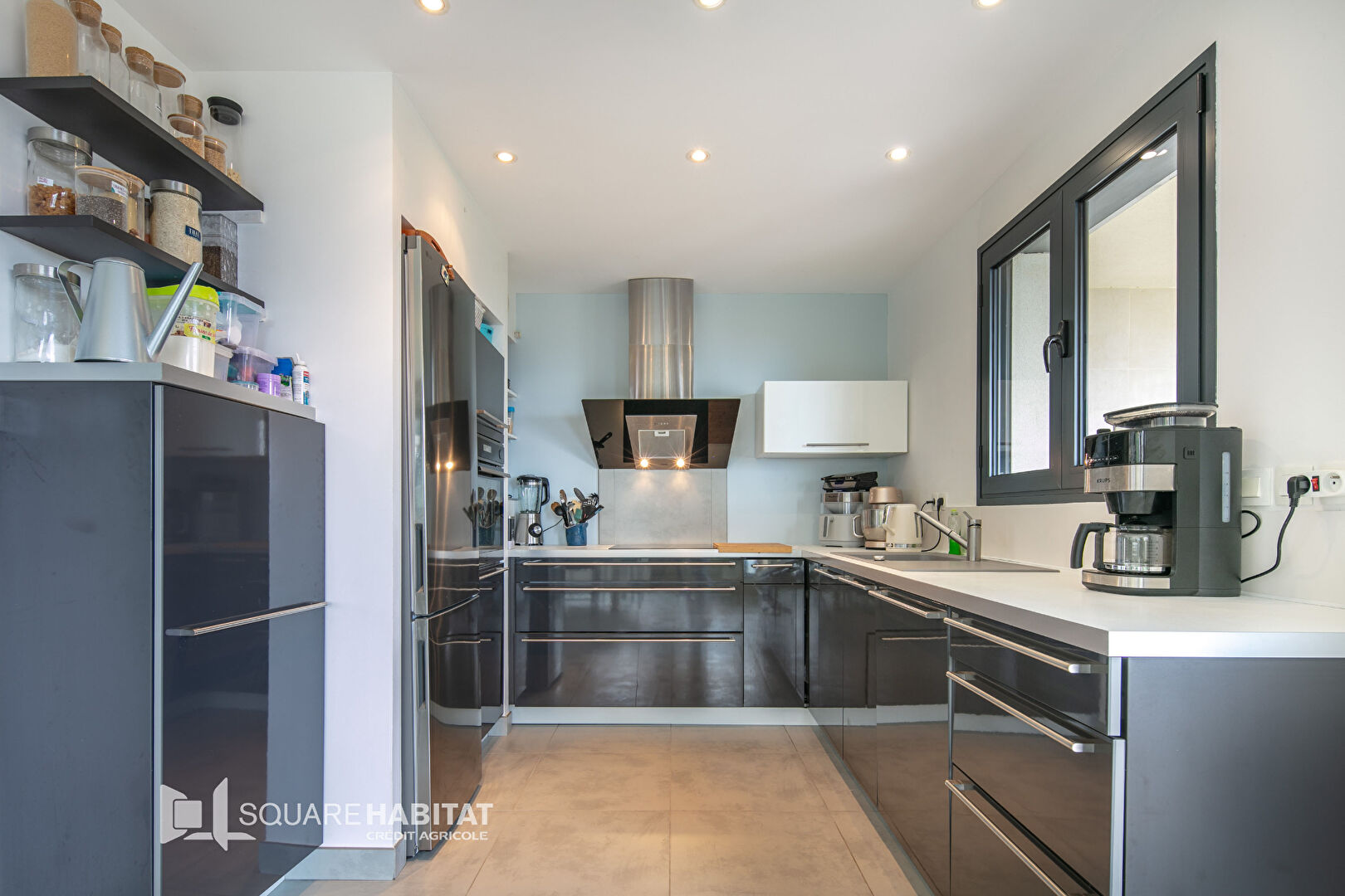 Une belle pièce de vie lumineuse avec cuisine ouverte aménagée et équipée ayant accès à une cuisine d'été et terrasse de 16 m² orientée Sud/Est avec vue dégagée.  Un hall d'entrée avec placard mural et des WC avec lave-mains. Ce niveau est accessible par l'extérieur ou par un escalier intérieur depuis le garage et le T2.