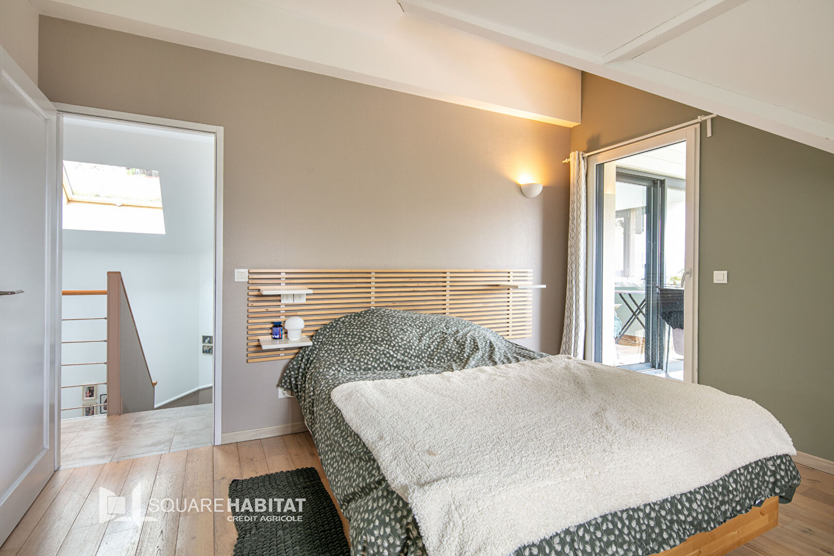 Un couloir dessert 3 chambres avec placards intégrés, dont une suite parentale avec salle d'eau privative, dressing et balcon de 5 m² exposé Sud/Est. Une Salle de bains avec sauna et espace jacuzzi avec puits de lumière et vue exceptionnelle sur Grenoble, WC.