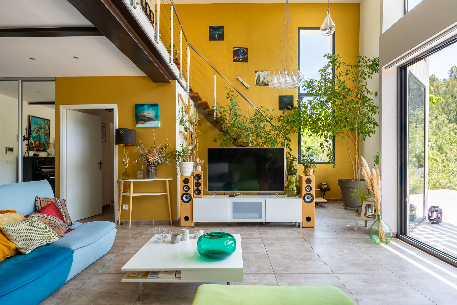 Dès l'entrée, l'espace impressionne : le vaste séjour baigné de soleil grâce à une exposition plein sud est sublimé par une hauteur sous plafond de plus de 5 mètres, offrant un volume rare et une circulation de lumière naturelle exceptionnelle.