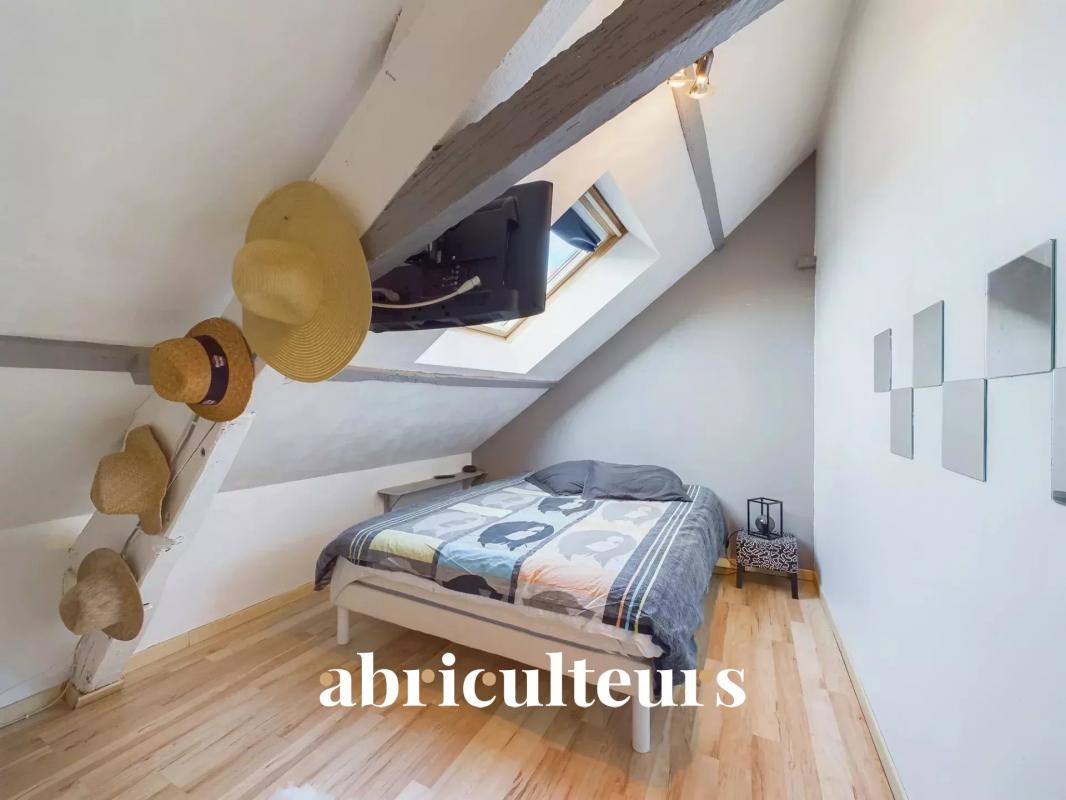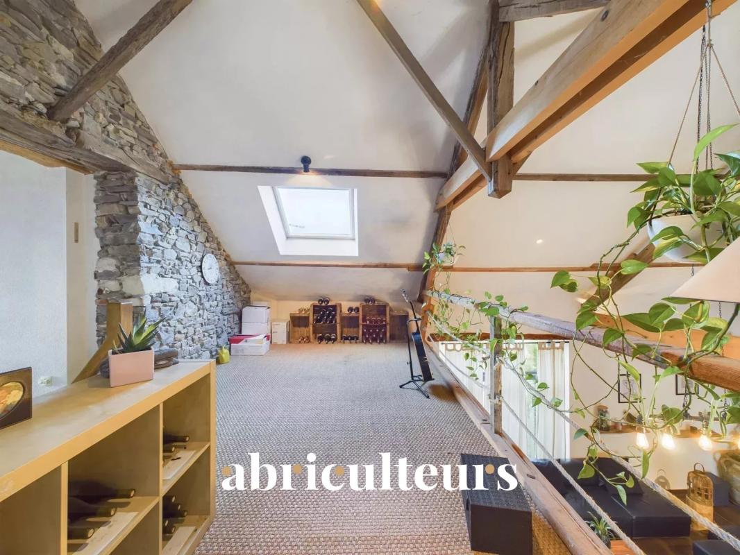 Un escalier mène à l'étage mansardé, offrant 90 m² de surface totale et 50 m² habitables. La mezzanine surplombe la pièce de vie, mettant en valeur les murs en pierre, les poutres et la cheminée. Un couloir dessert des toilettes, une salle de bain avec douche et baignoire, ainsi que trois chambres, dont une pouvant servir de dressing.