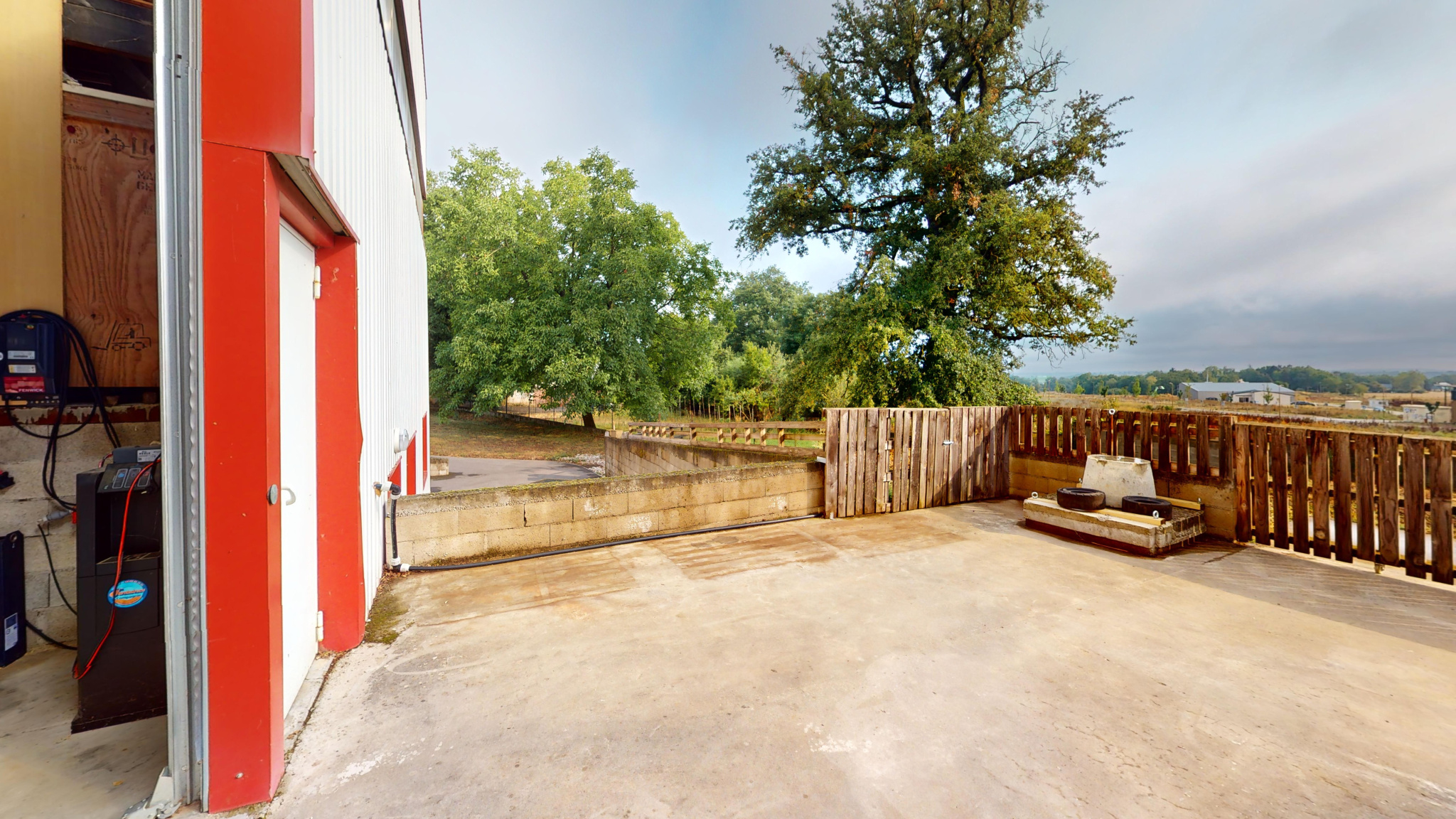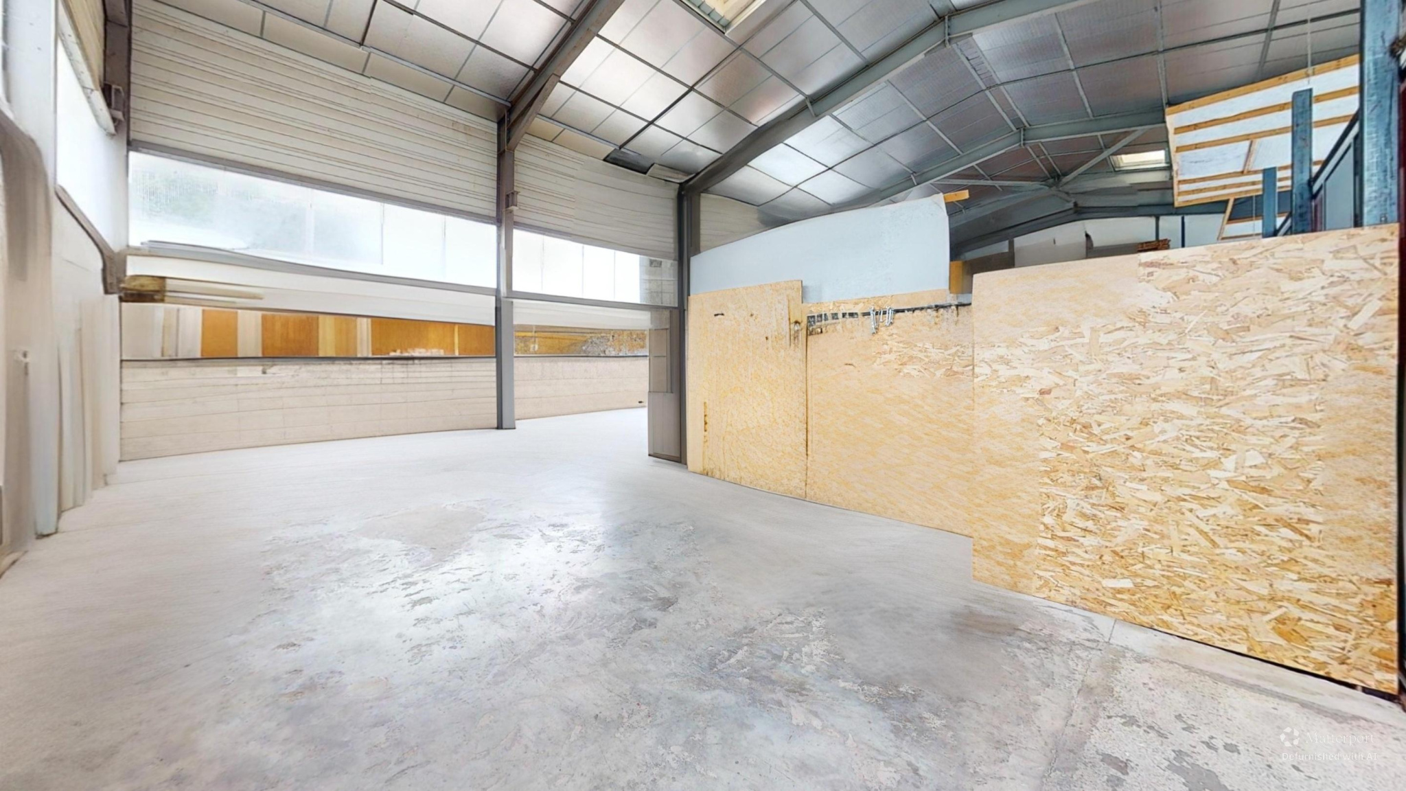 Plus en retrait, sur la partie goudronnée de la parcelle, se trouve un grand bâtiment industriel de 400 m2, doté d'une belle structure, d'une hauteur sous pente de 6,80 m et de 8,70 m sous faîtage. Il dispose également d'un quai de livraison poids lourds et il est également possible d'installer un pont roulant
