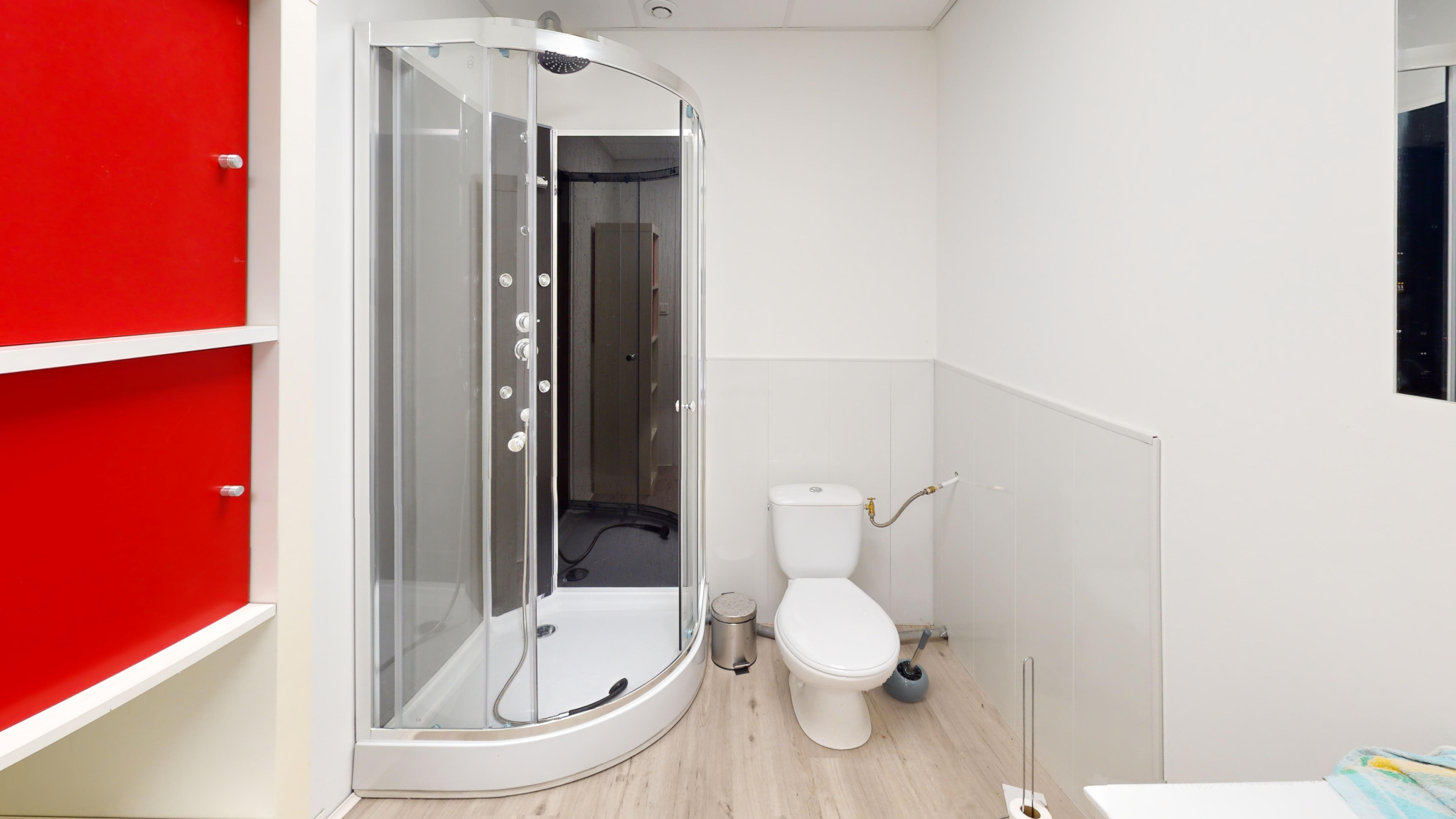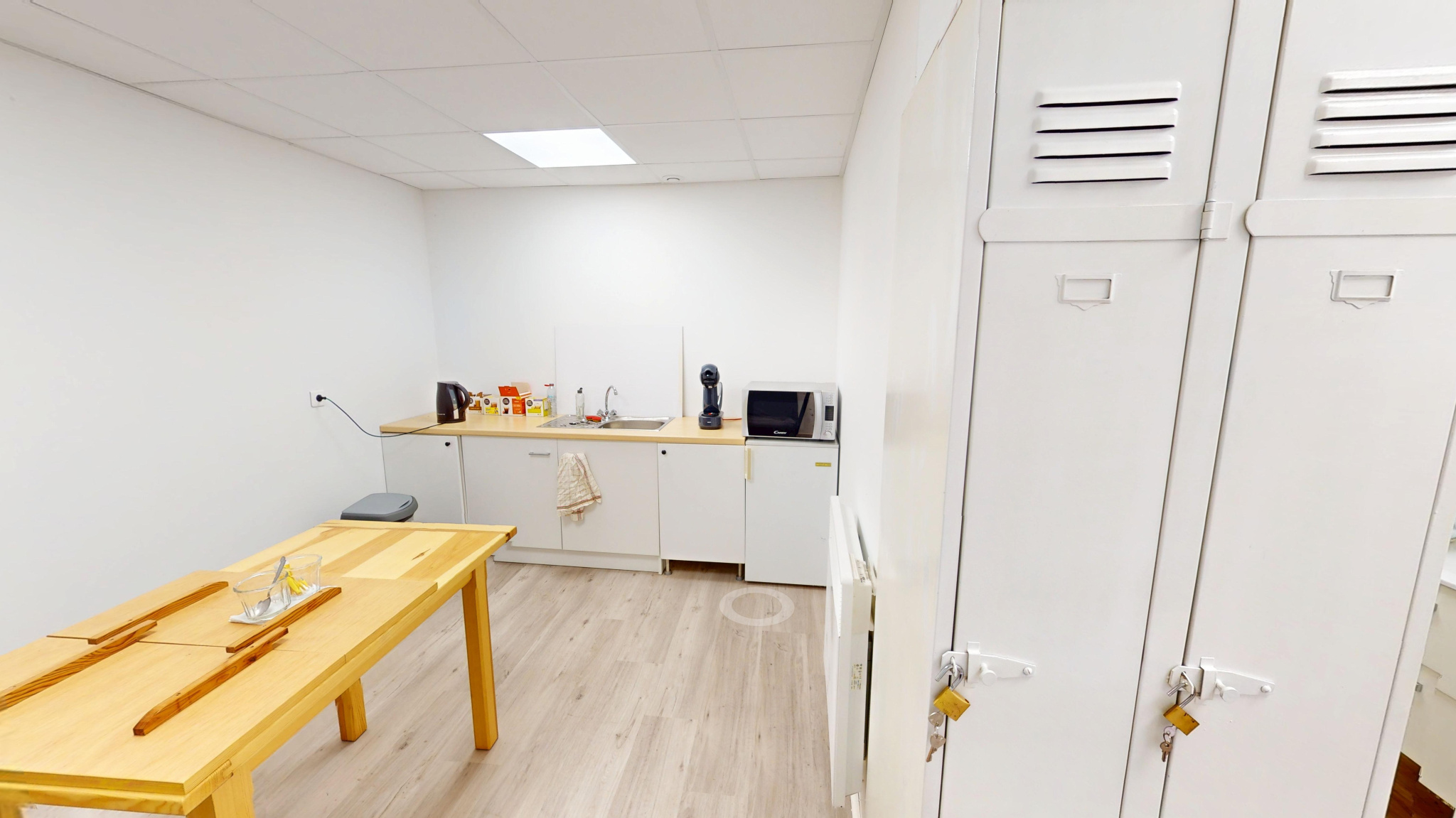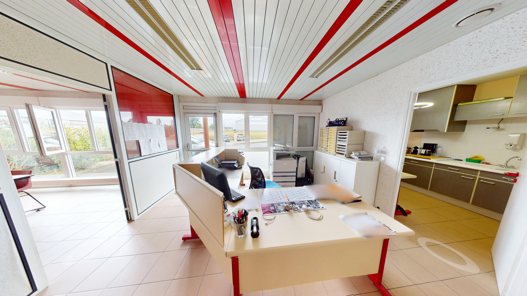 Le premier bâtiment se compose d'un espace bureau comprenant un accueil, une salle de réunion, une cuisine et des sanitaires. À l'étage, deux autres espaces pouvant servir de bureaux ainsi qu'un grand dégagement complètent l'ensemble, pour une surface d'environ 100 m2.
