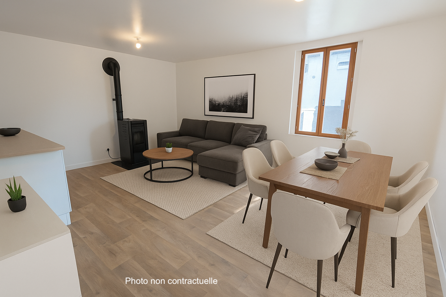 Composé de 3 chambres , une pièce de vie ouverte sur la cuisine avec un poêle à granulés, une salle d'eau, un WC et un cellier.