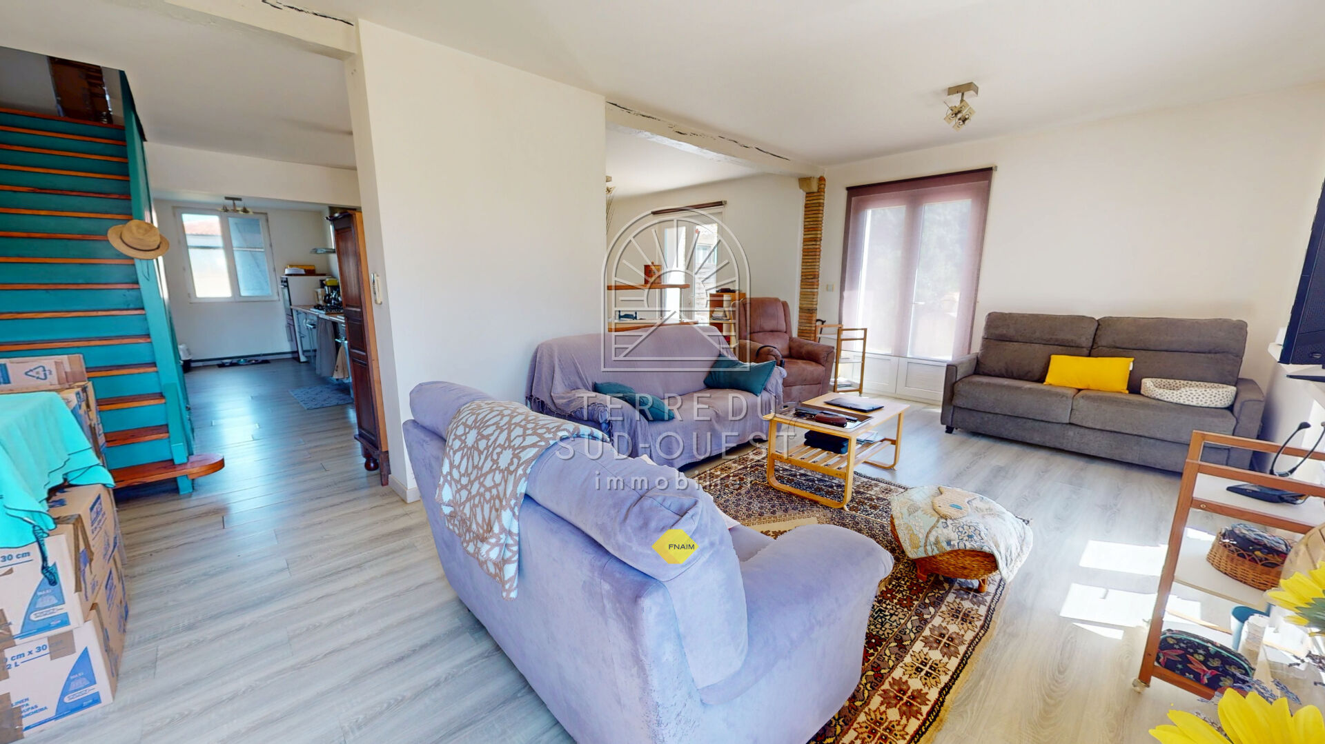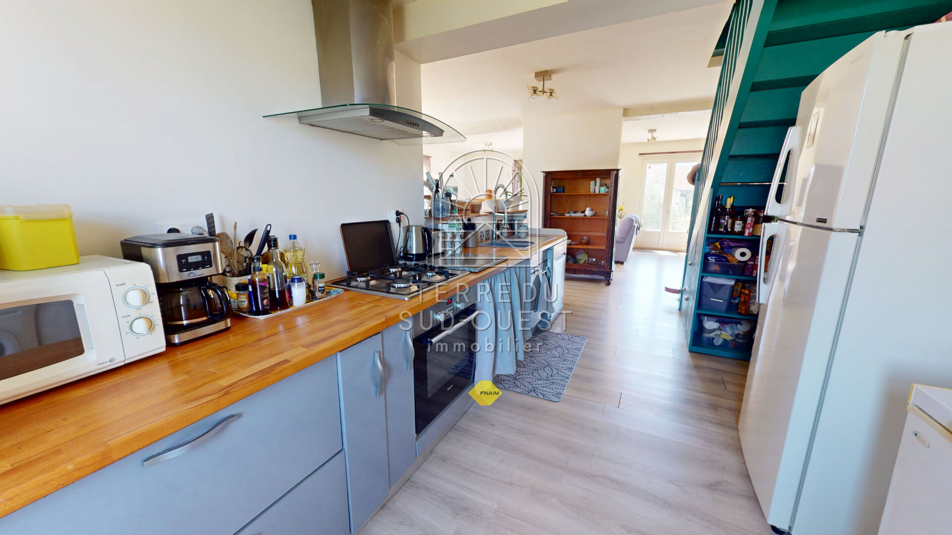 Elle se compose au rdc d'un vaste salon/séjour lumineux donnant sur une grande cuisine ouverte, d'un wc et d'une pièce pouvant faire office de chambre ou de bureau.