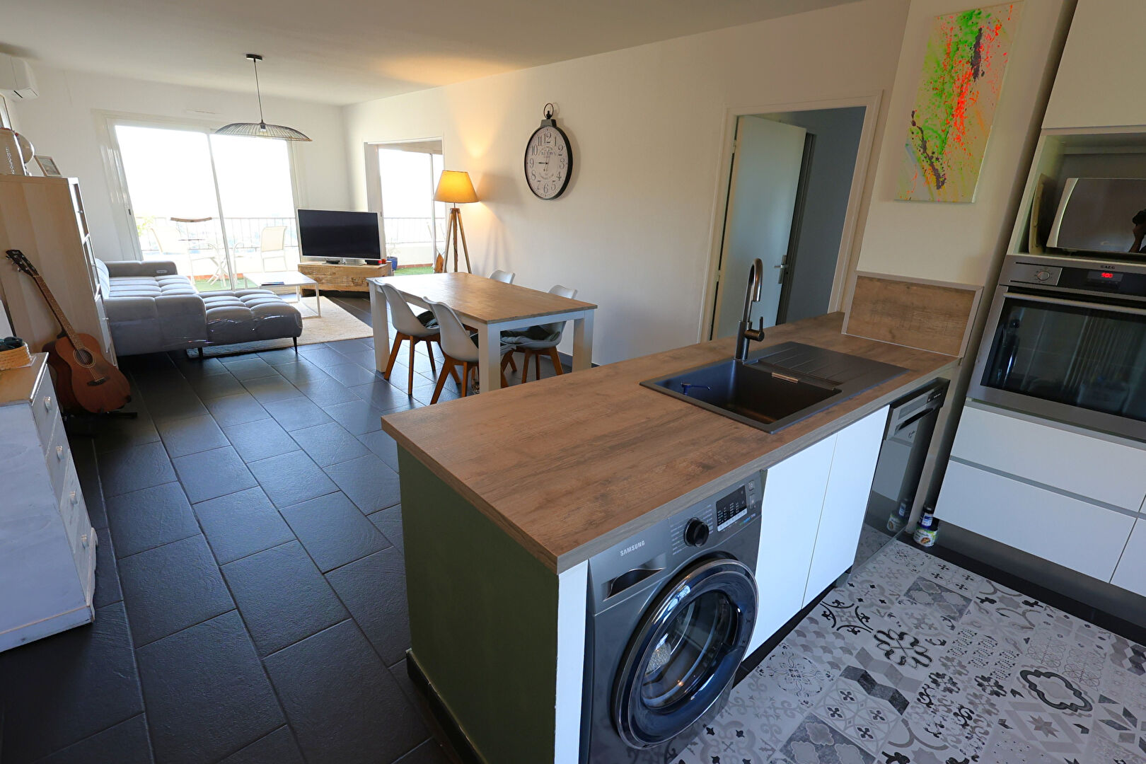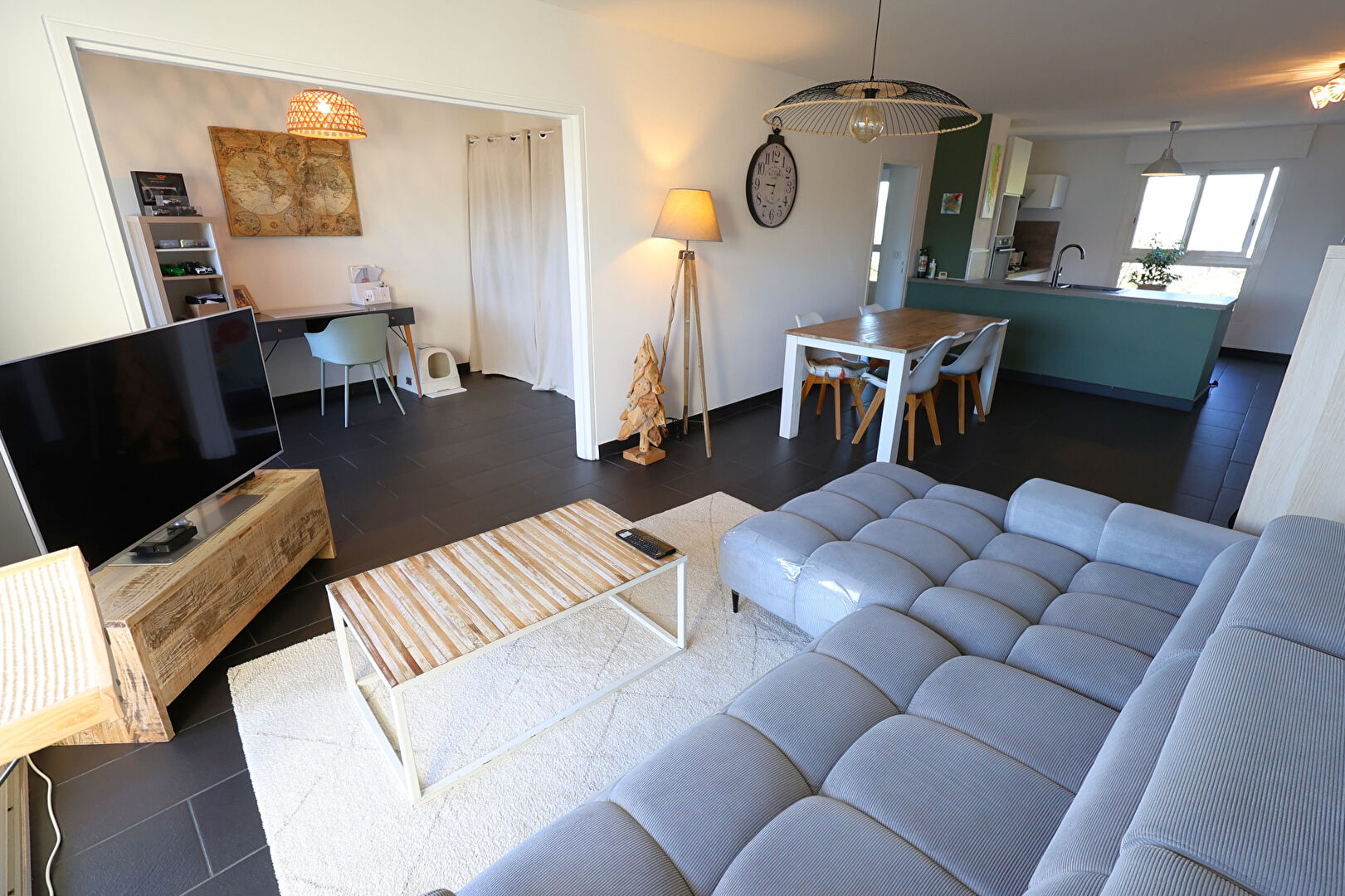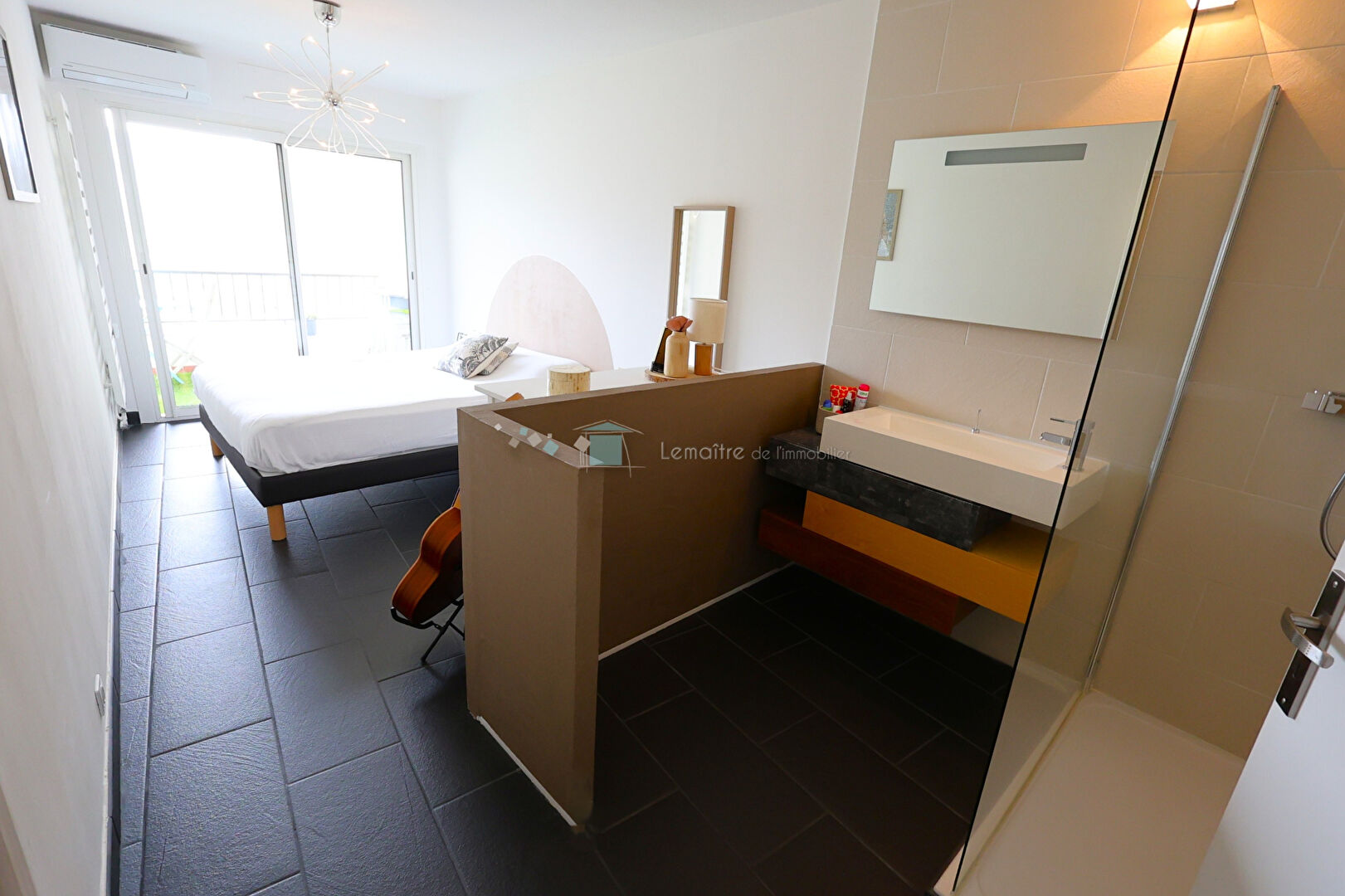 Il se compose d'une cuisine équipée et aménagée ouverte sur spacieux séjour salon de 35 m² , le tout donnant accès à un balcon de 13 m² avec belle vue dégagée