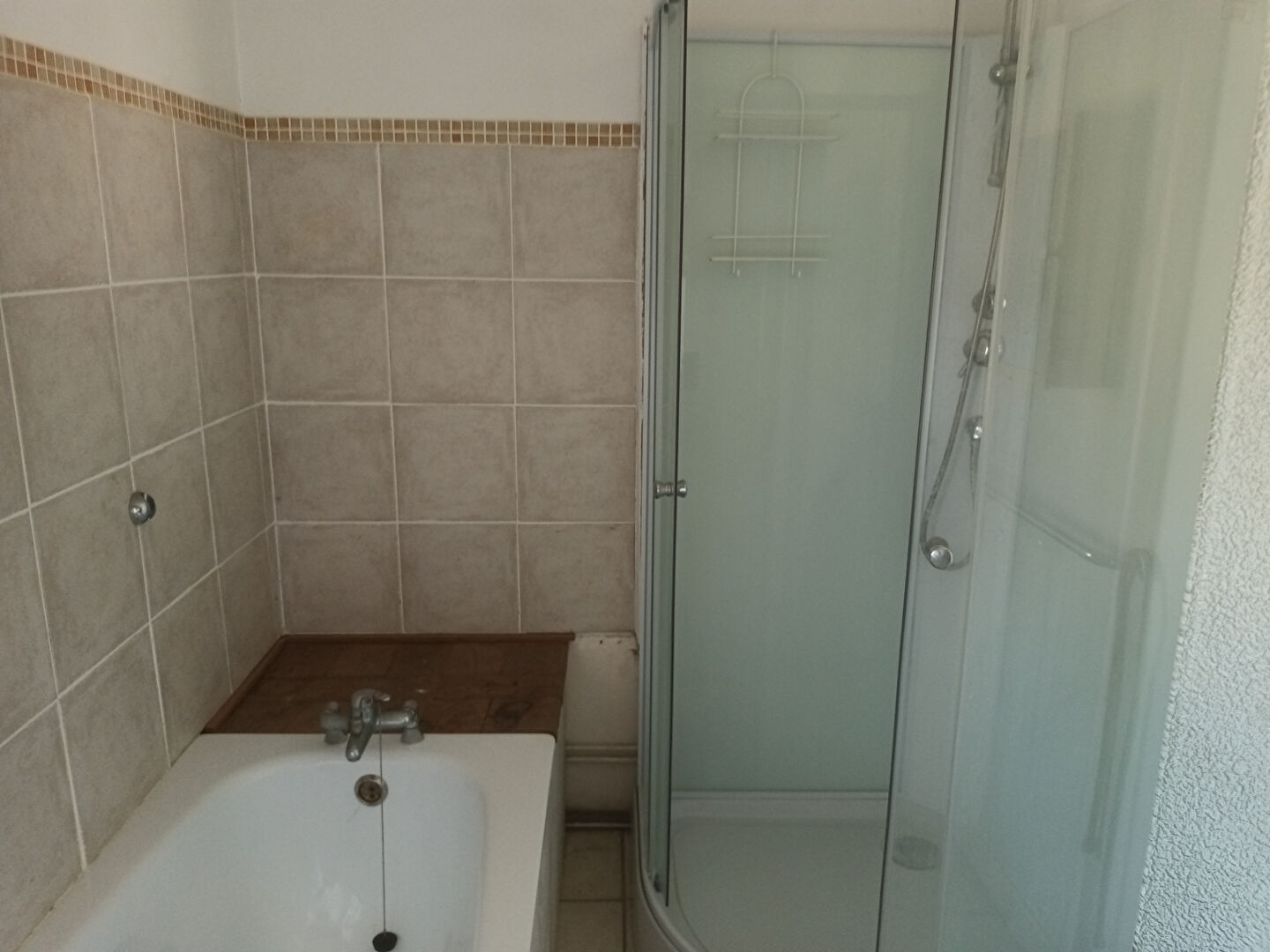 À l'étage, couloir, salle de bain avec douche/lavabo. WC.