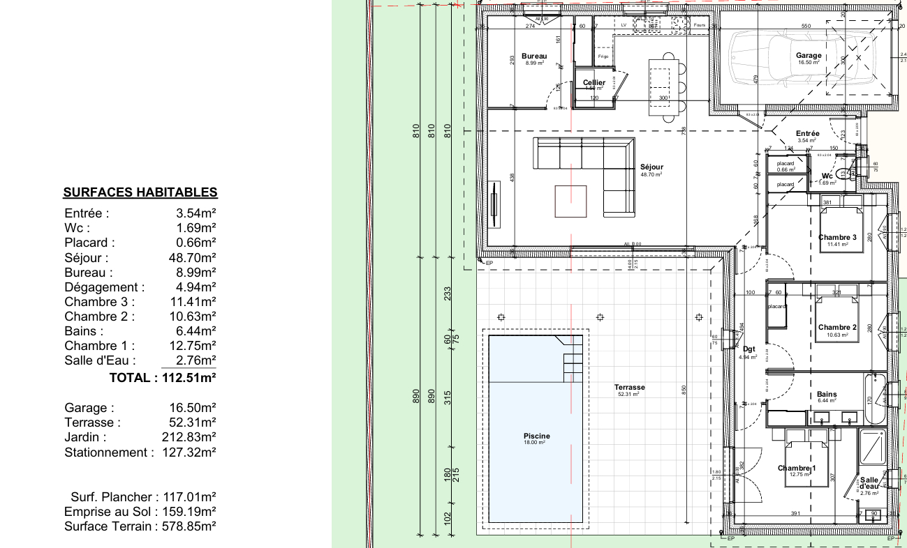 Cette maison neuve de 112m2 environ composée d'une grande pièce de vie, de 3 chambres dont une avec douche et lavabo, d'un bureau pouvant servir de quatrième chambre, salle de bain, garage avec porte électrique sur parcelle clôturée d'environ 578m2. Juste les valises à poser.....