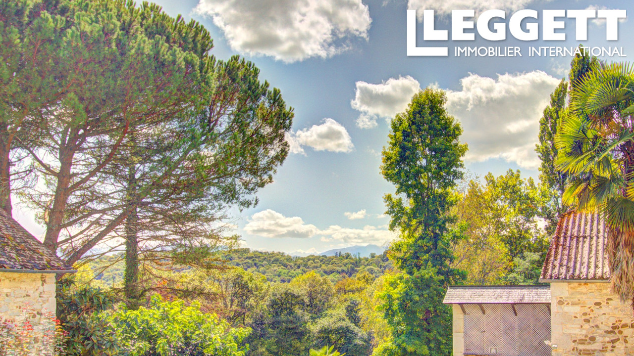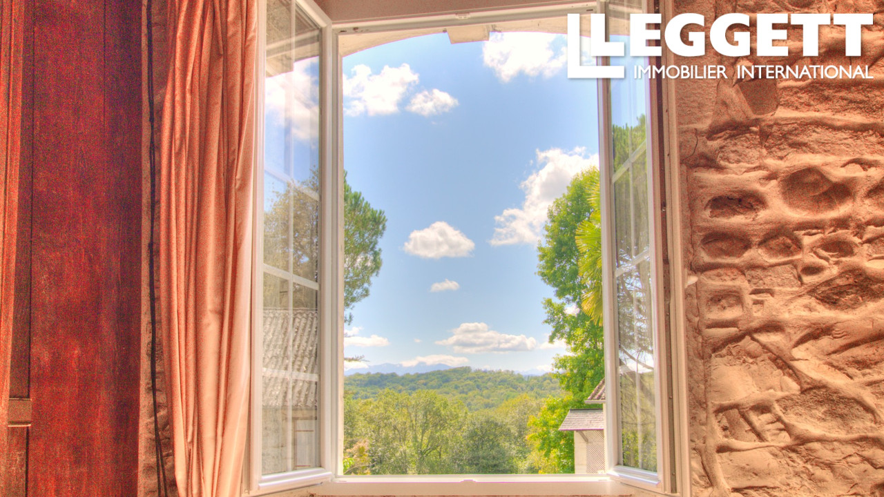 Au-delà de la cour, le terrain en pente douce s'étend sur 5 hectares, comprenant forêt, prairie et une mare alimentée par une source. À l'horizon, la vue panoramique sur les Pyrénées est époustouflante!