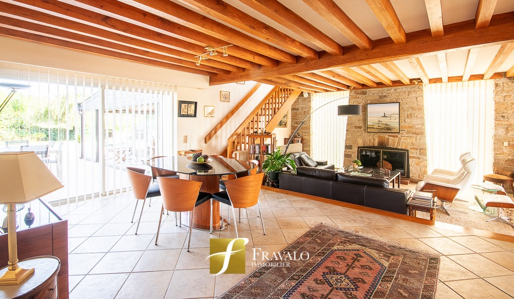 Située dans un cadre calme et privilégié, belle maison d'architecte de 250 m2 avec vue sur la mer. Au rez-de-chaussée, l'entrée ouvre sur un vaste salon-séjour avec cheminée de 70 m2, un salon d'été pour les beaux jours, une cuisine indépendante aménagée-équipée et son arrière-cuisine, une spacieuse suite parentale avec dressing et salle de bains, un bureau, une salle d'eau et un garage avec mezzanine. A l'étage, une grande mezzanine dessert trois belles chambres, une salle de bains et un grenier. Le sous-sol se compose d'une buanderie-chaufferie et d'une cave. Un magnifique terrain paysager d'environ 4000 m2 avec piscine chauffée, garages, atelier, local vélos et abri de jardin complète les prestations de cette propriété d'exception. Estimation des coûts annuels d'énergie pour un usage standard du logement: entre 2700 EUR et 3710 EUR (abonnement compris). Les informations sur les risques auxquels ce bien est exposé sont disponibles sur le site Géorisques : georisques.gouv.fr