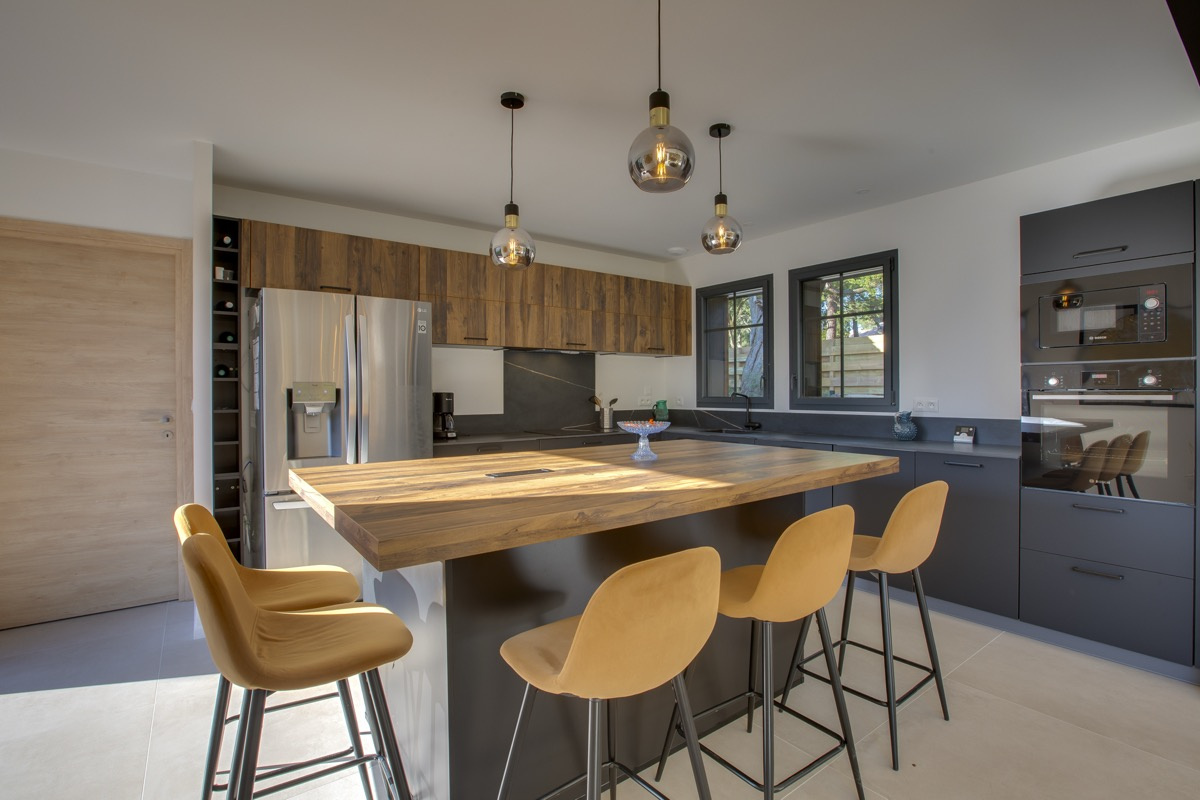 Édifiée sur un terrain plat de plus de 600 m2, soigneusement aménagé, la maison développe environ 150 m2 et répond aux normes RE 2020. Elle conjugue confort contemporain et élégance balnéaire, soulignée par un bardage inspiré du style Cap-Ferret.