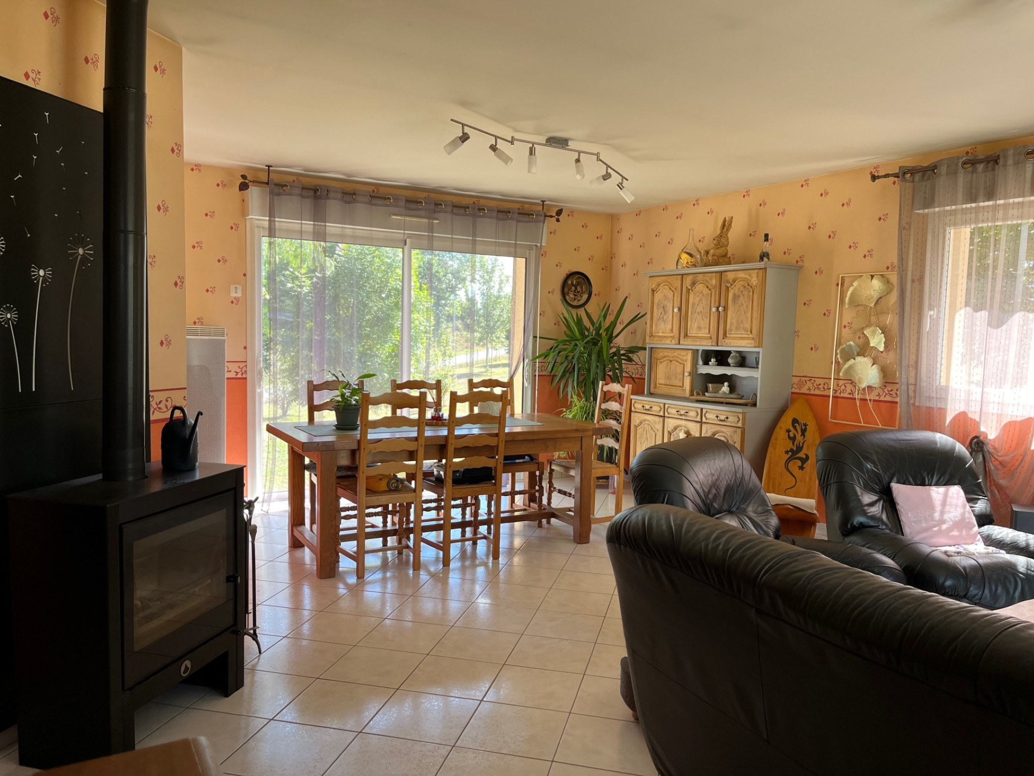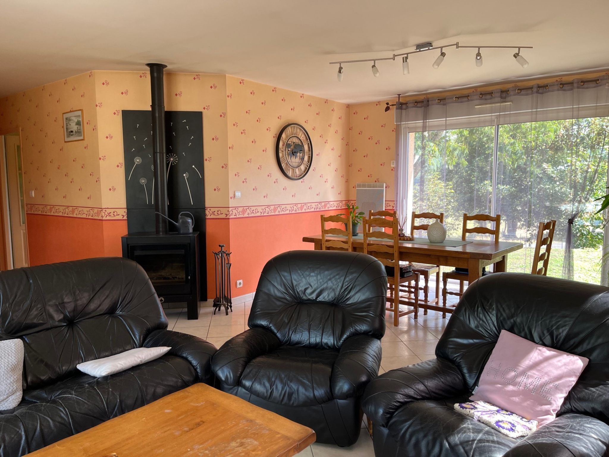 Rez-de-chaussée : entrée ouverte sur séjour (35,65m2) avec poêle à bois et 2 baies fenêtres ouvrant au jardin chacun avec leur terrasse avec store. Cuisine équipée avec cellier, 3 chambres avec placards et salle d'eau et wc.