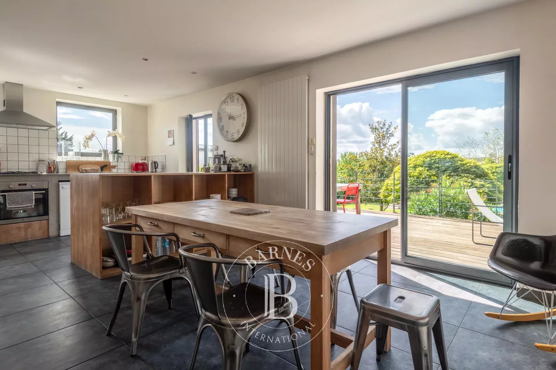L’extérieur dévoile un grand terrain arboré, une piscine élégante et une cuisine d’été conviviale, parfaits pour recevoir et profiter des beaux jours.