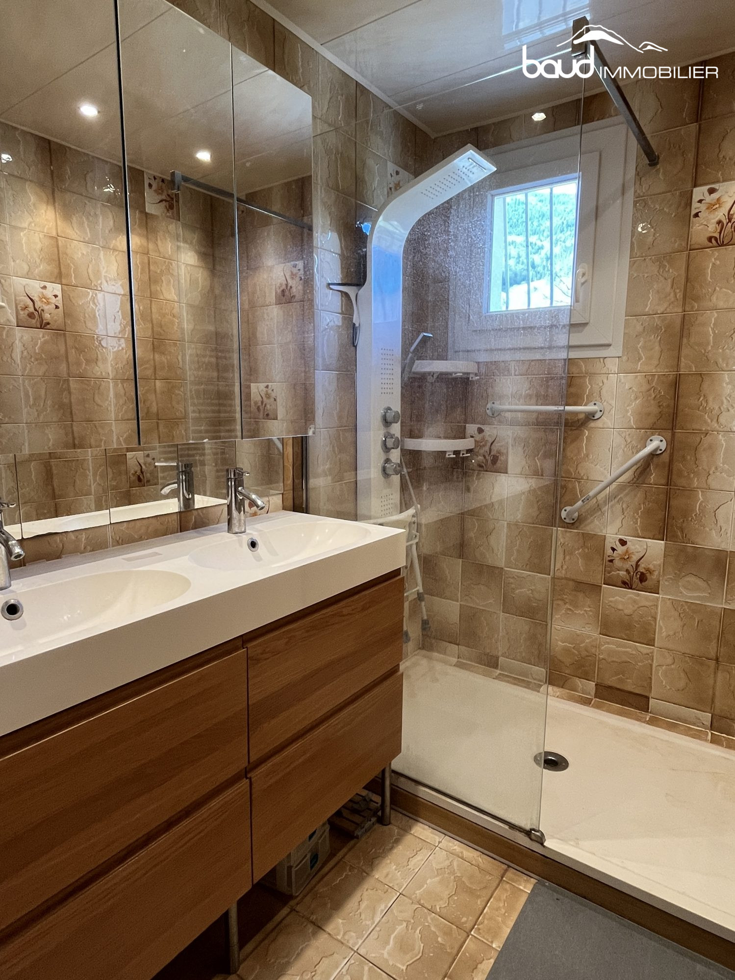 - La maison 1, d'une surface totale de 220 m2, bénéficie d'une belle surface de plein pied de 100 m2 qui se compose d'un salon/salle à manger ouvert sur cuisine, d'une salle d'eau, de trois chambres, de WC indépendant, d'une véranda et donne sur une belle terrasse orientée au sud.