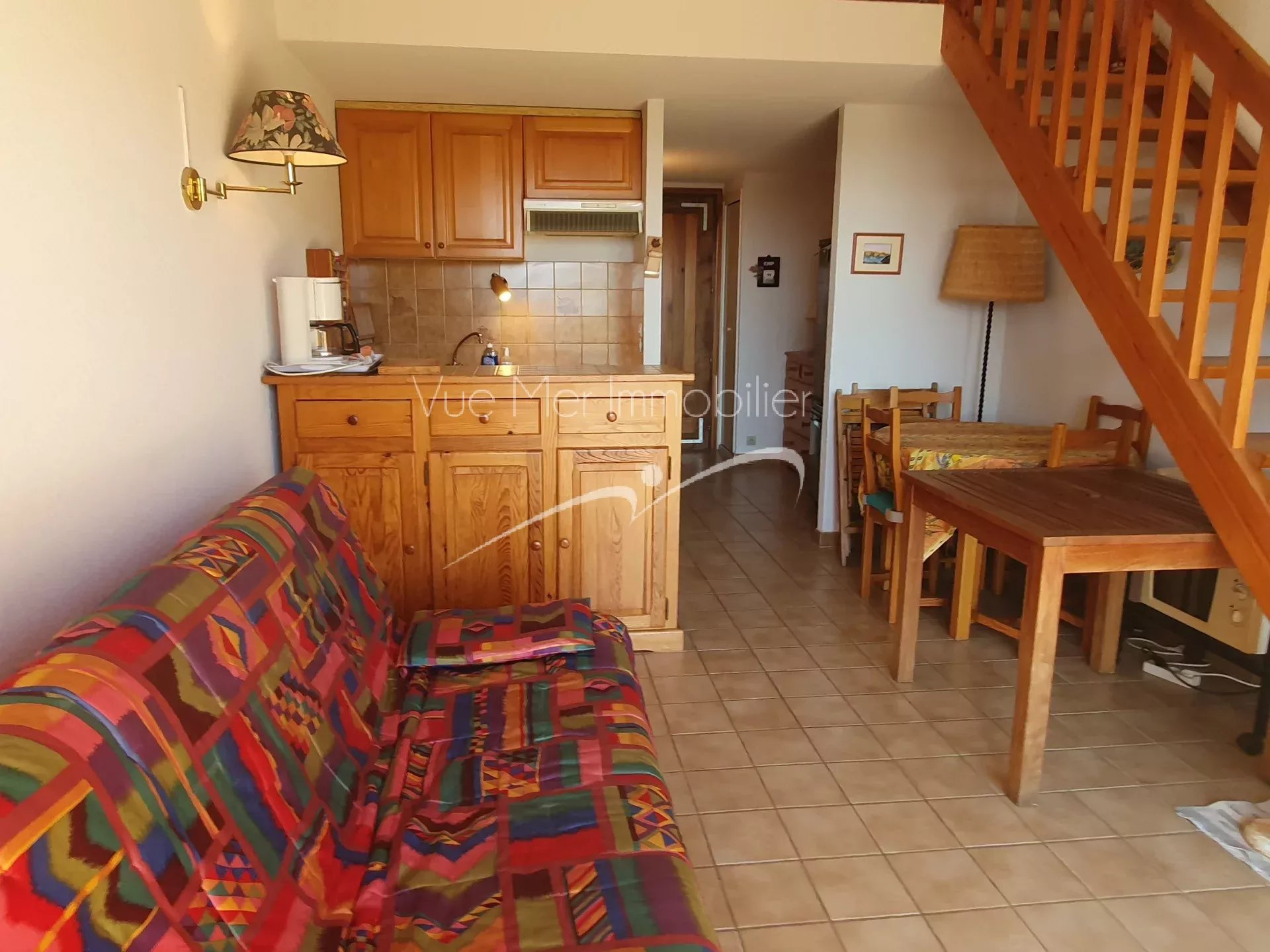 A 650 mètres de la plage de Saint Clair, soit environ 8 minutes à pied et à 400 mètres des premiers commerces, appartement de type studio cabine avec mezzanine (4/6 couchages), d’environ 38 m² au sein d’une petite résidence située en bout d’impasse : calme.