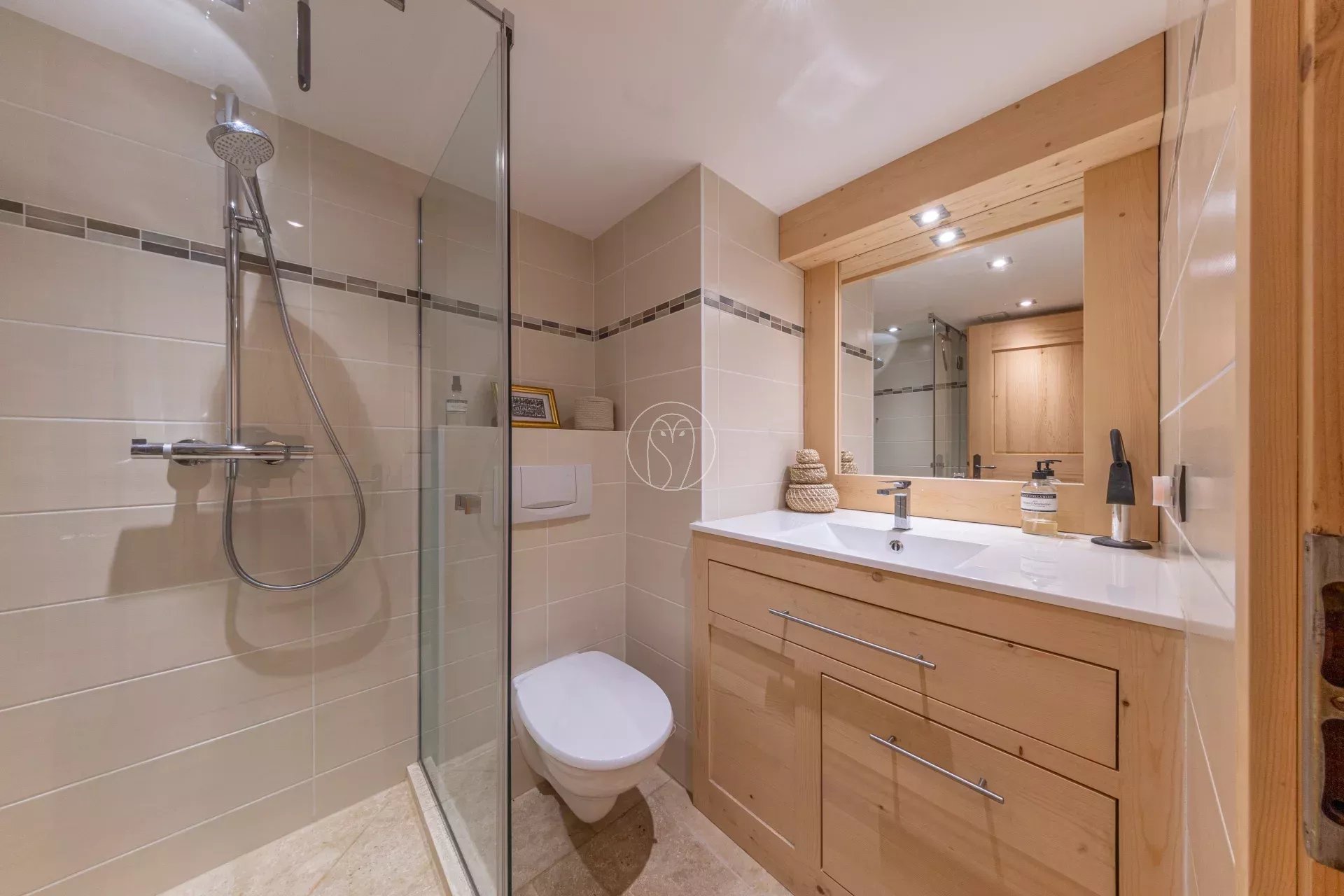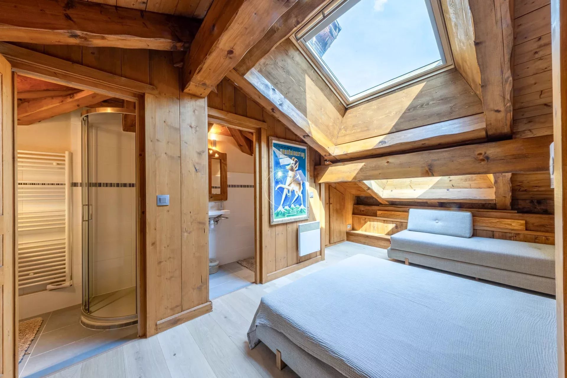 À l'étage supérieur, une chambre en mezzanine avec salle de douche et WC séparé.