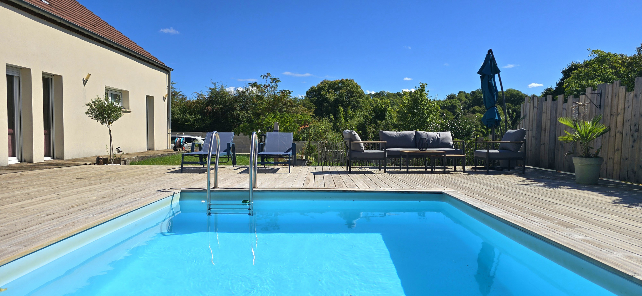 A l'extérieur vous pourrez profitez d'un agréable jardin clos et arboré et d'une terrasse aménagée de 130 m2 où il reigne un petit air de vacances avec sa piscine chauffée 6x3 récemment installée.