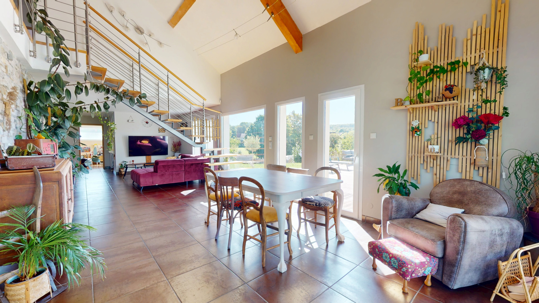Au rez-de-chaussée vous disposerez d'un hall d'entrée, cuisine meublée et équipée ouverte sur un salon/séjour à plafond cathédral, chambre, cellier, toilette indépendant et double garage/atelier.