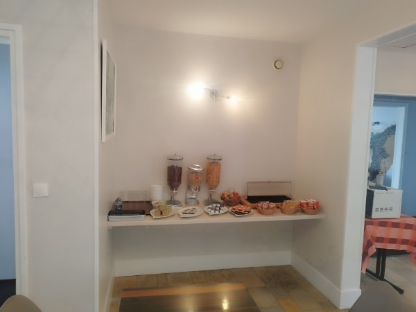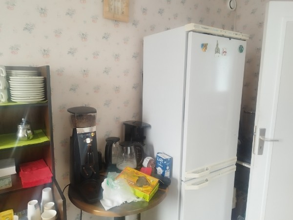 Hall d'accueil spacieux avec un wc PMR et un wc, lavabo, salle de petit déjeuner et cuisine équipée avec machine à café, réfrigérateur congélateur.