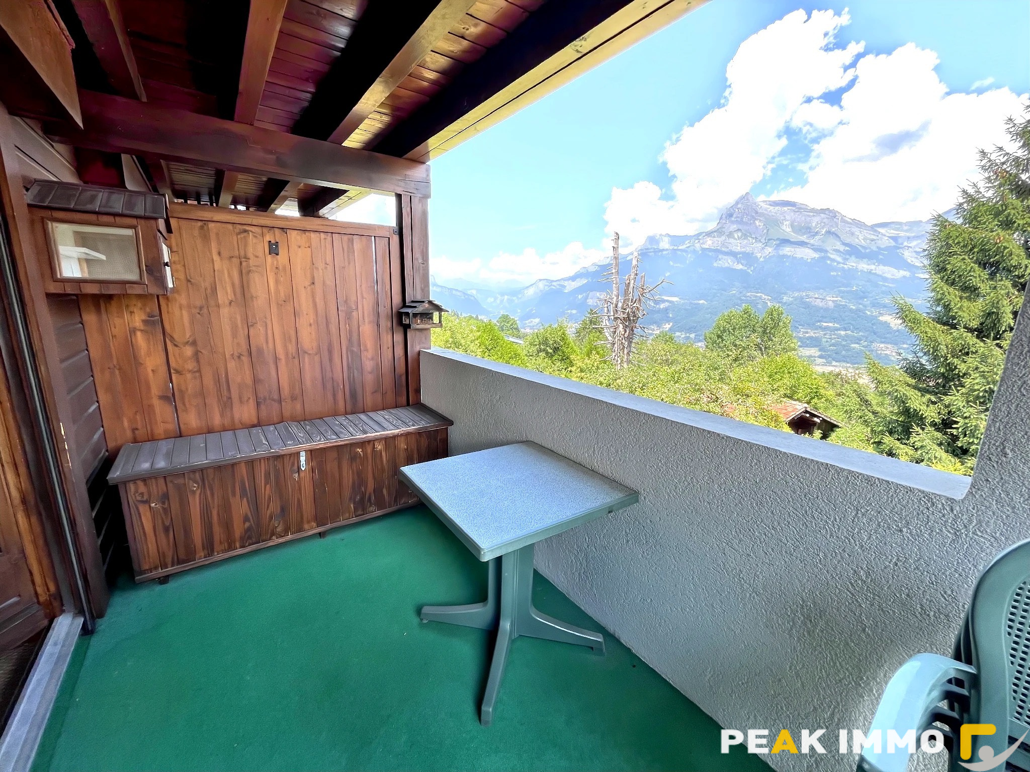 Vue à 180oC depuis la grande terrasse couverte de ce vaste studio avec alcôve, au centre du village de Combloux !