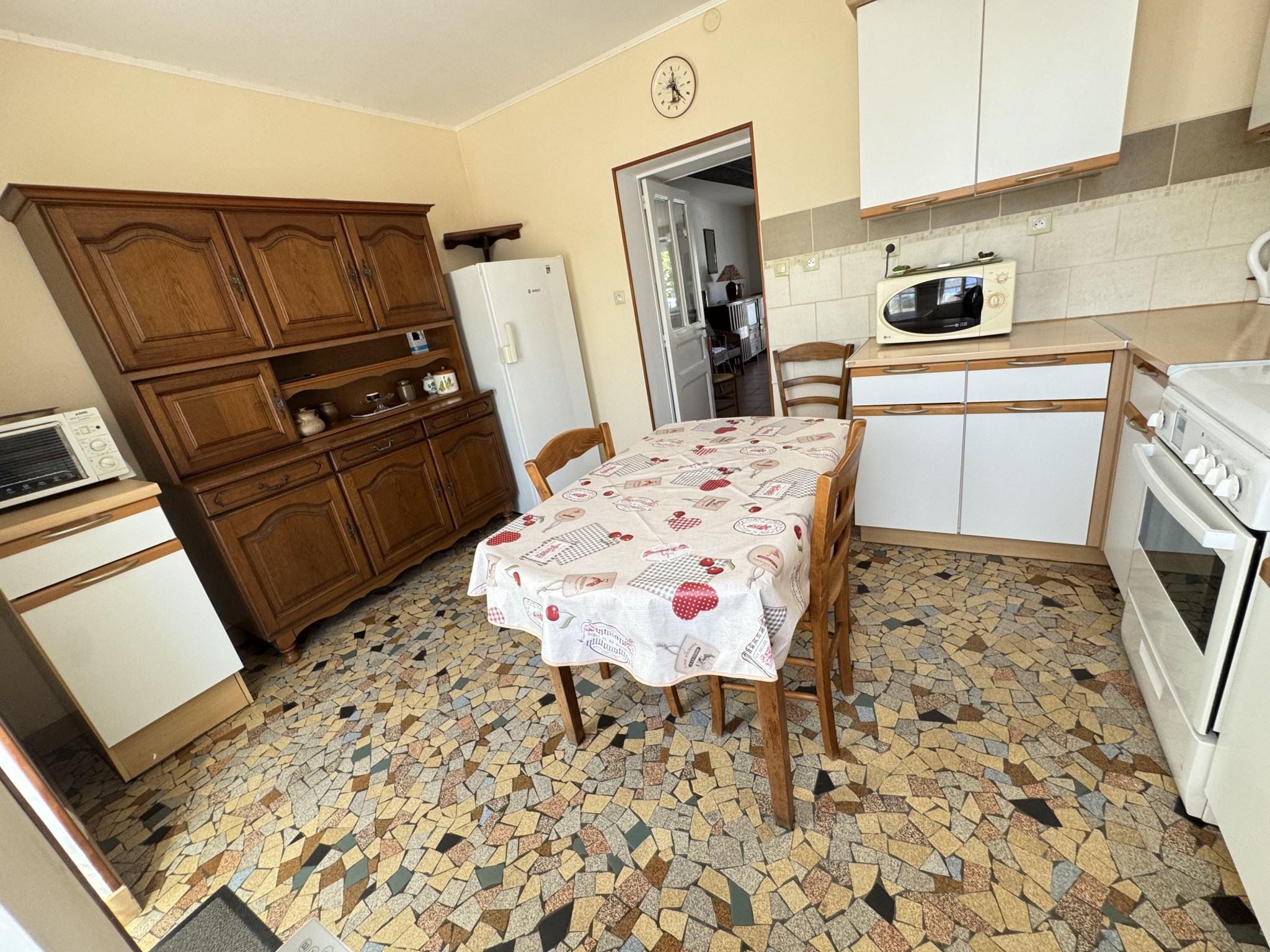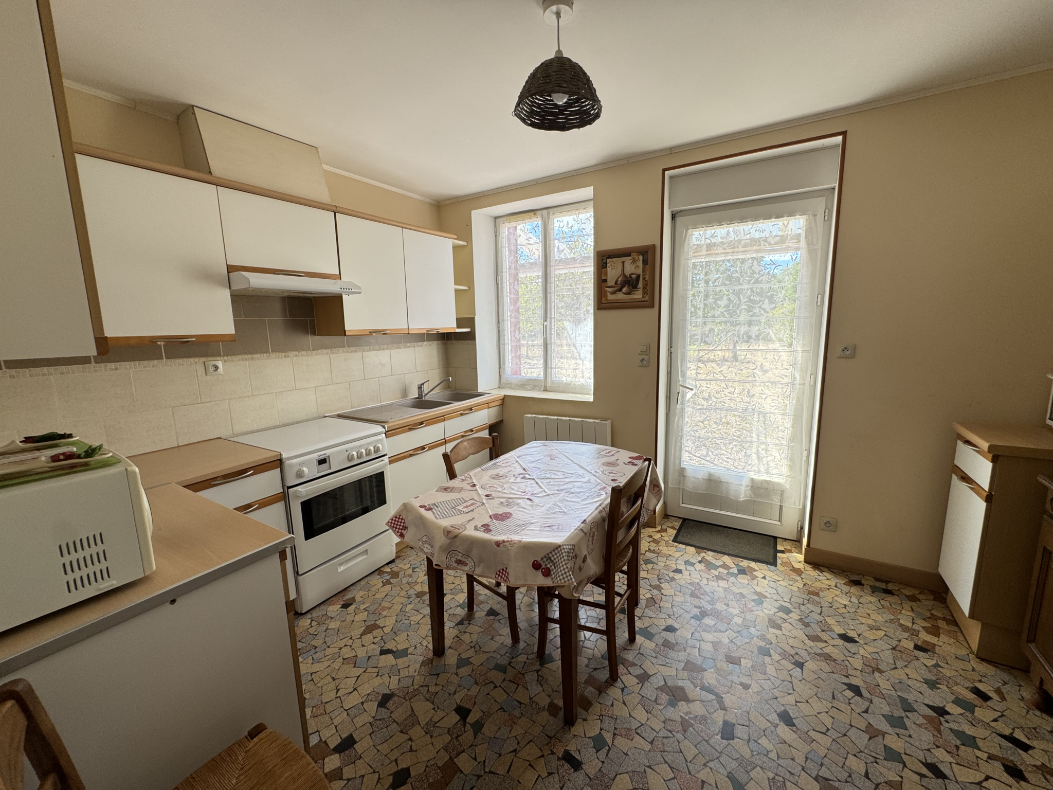 d'une cuisine lumineuse de 11,24 m2 avec porte-fenêtre donnant sur le jardin,