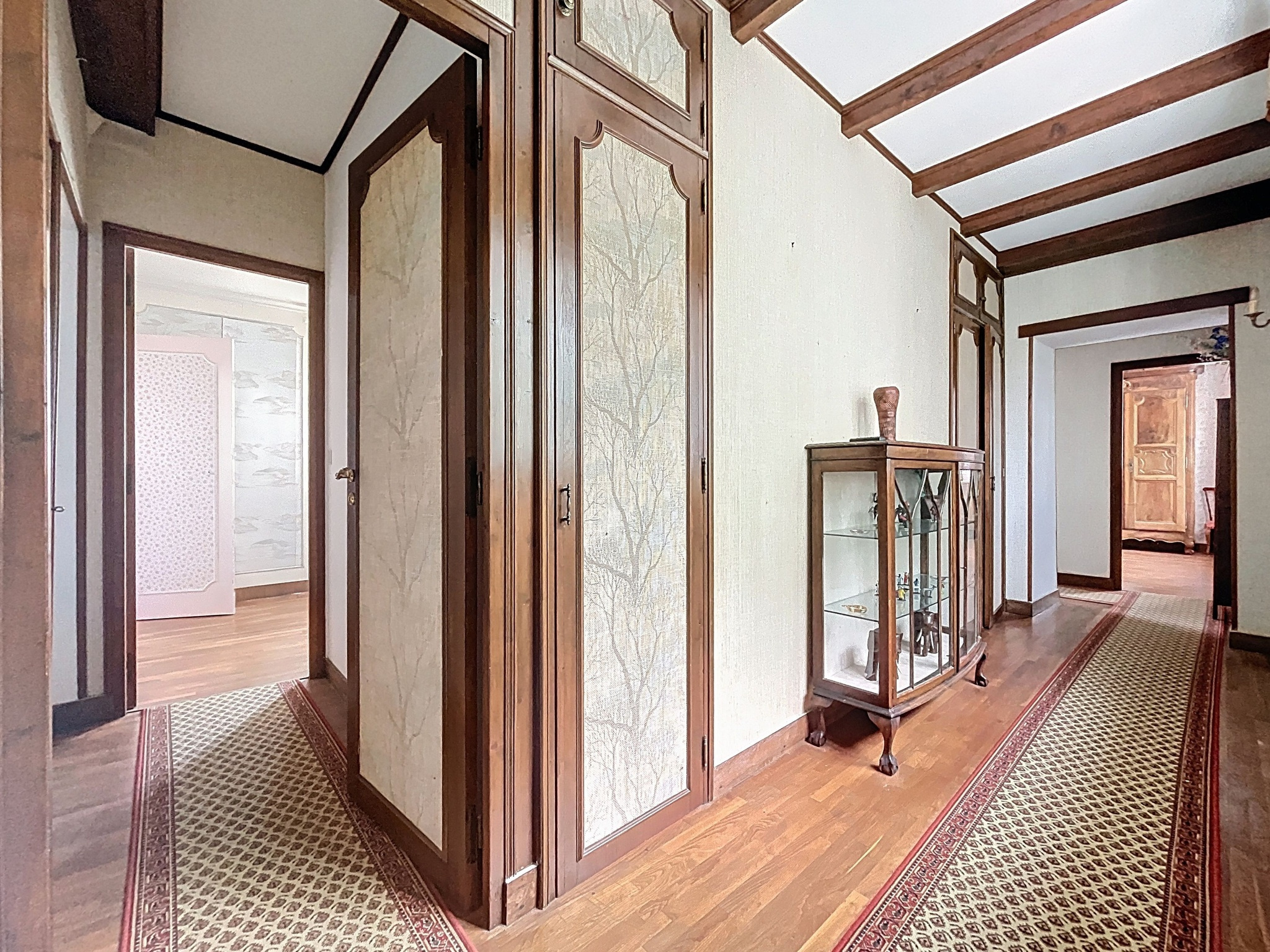 Au premier étage, un couloir dessert une grande chambre avec salle de bains attenante, une seconde dotée d'un coin d'eau, ainsi qu'une troisième chambre.