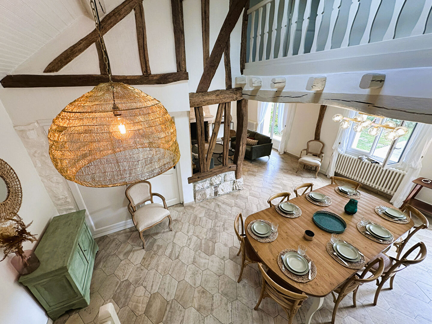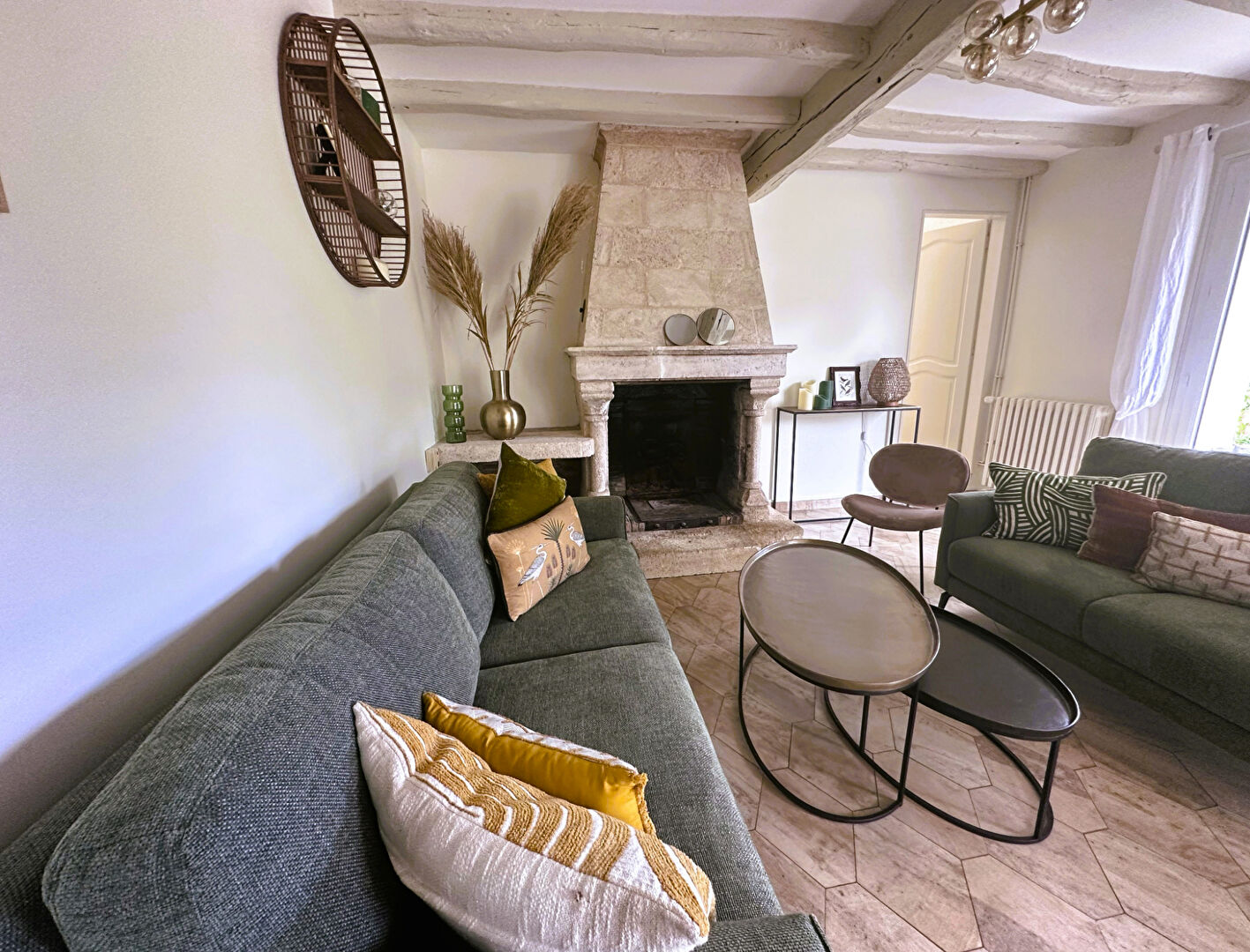 Grand séjour lumineux avec cheminée et plafond cathédrale