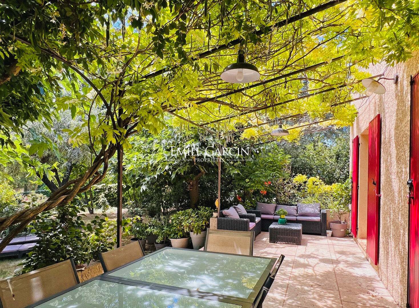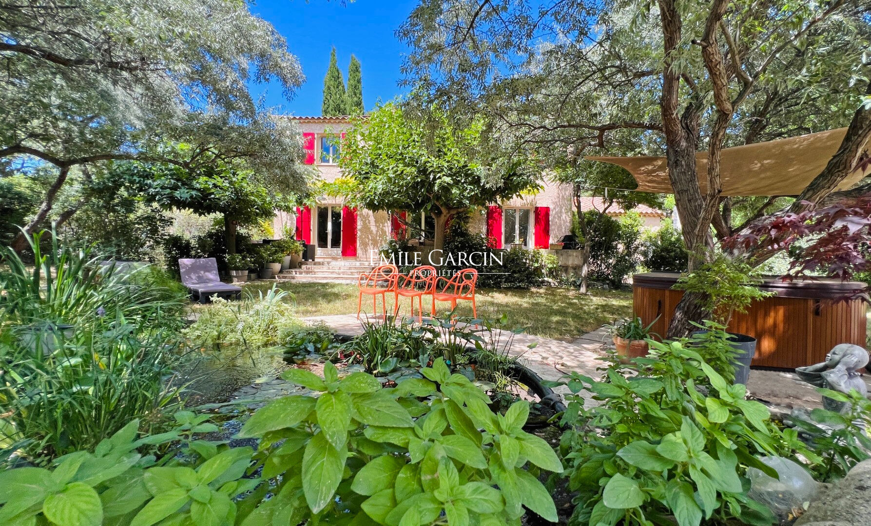 A l'extérieur, un jardin arboré de 3500 m² , piscine 11 x 5 m, terrasse ombragée.