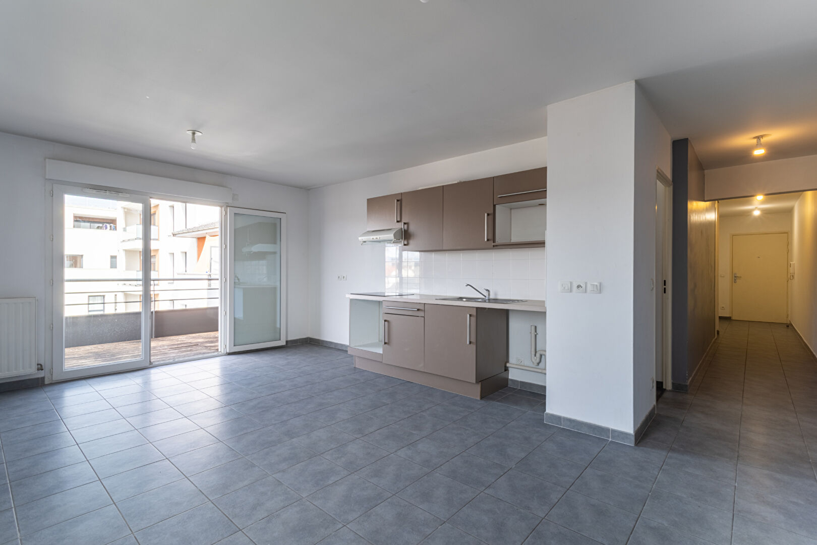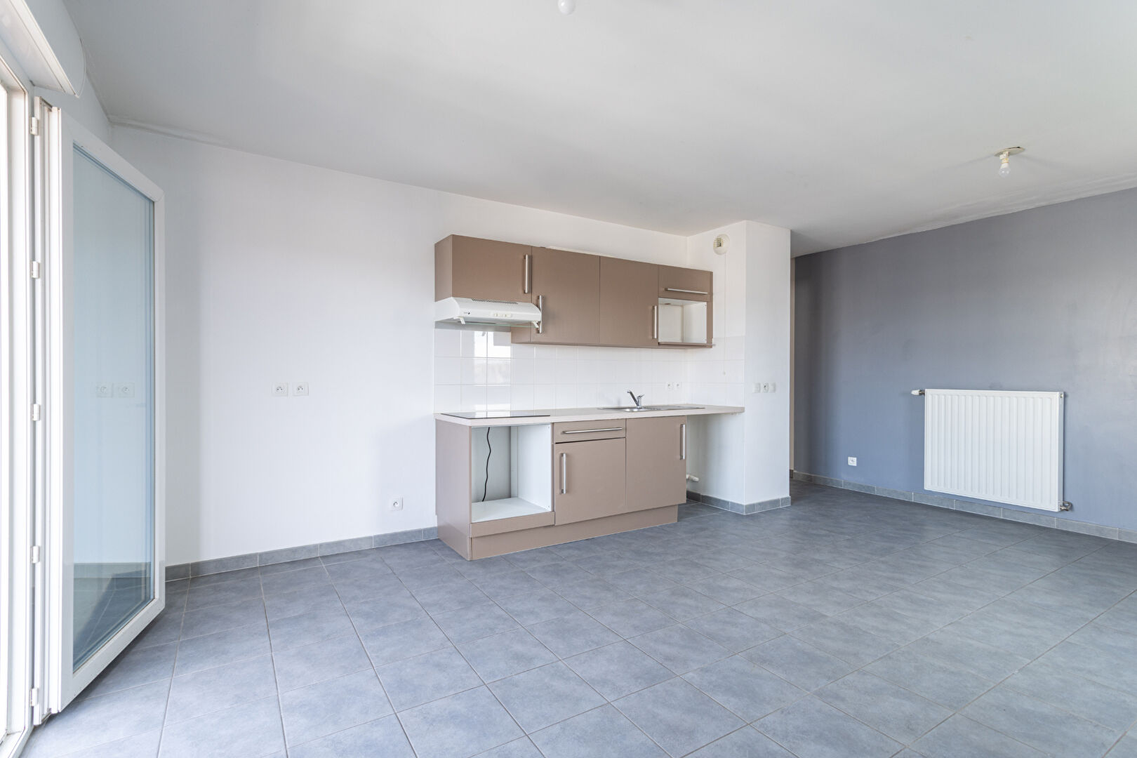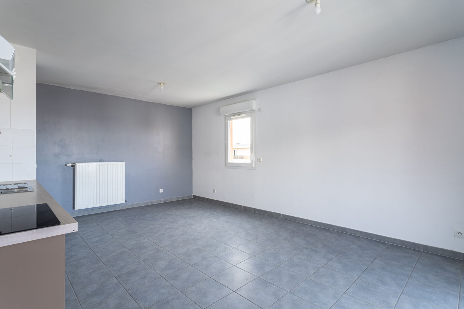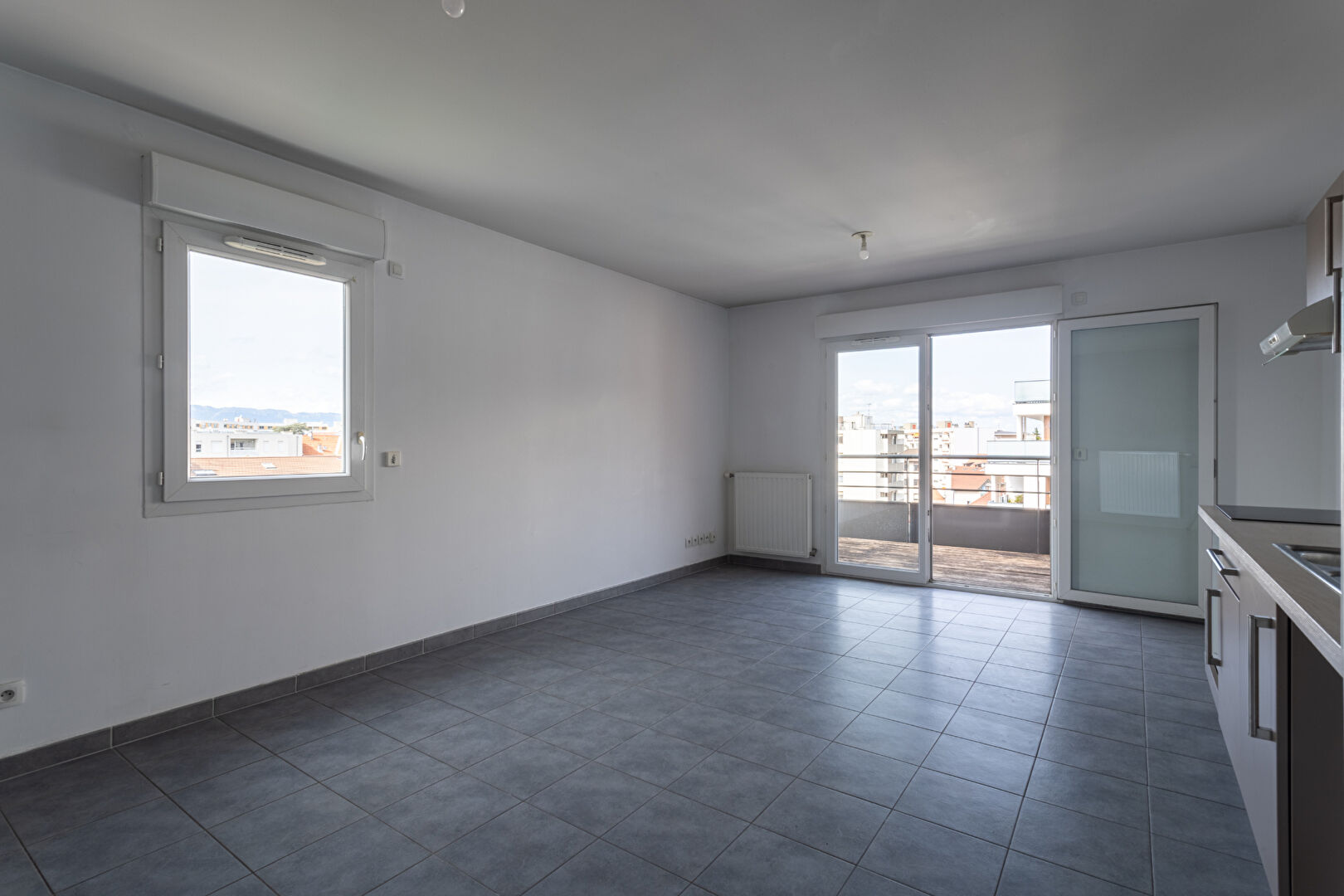 Le salon est ouvert sur la cuisine et dispose d'un balcon.