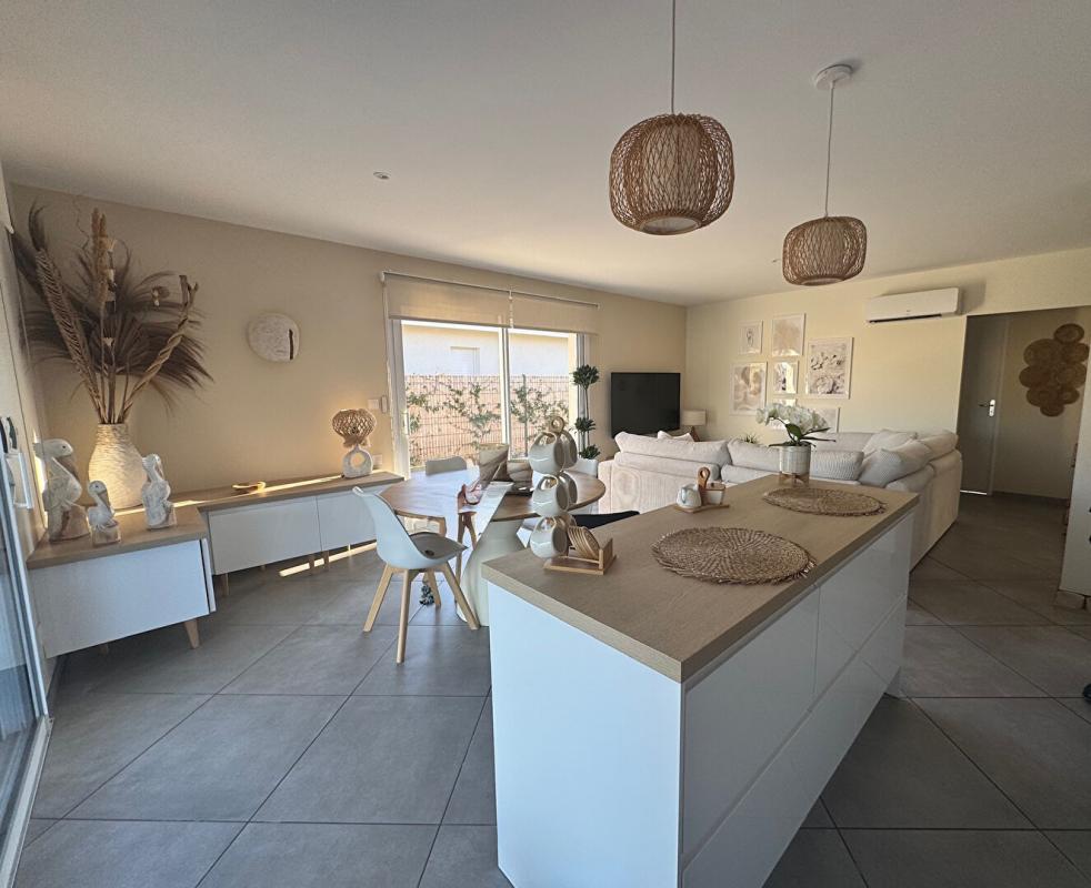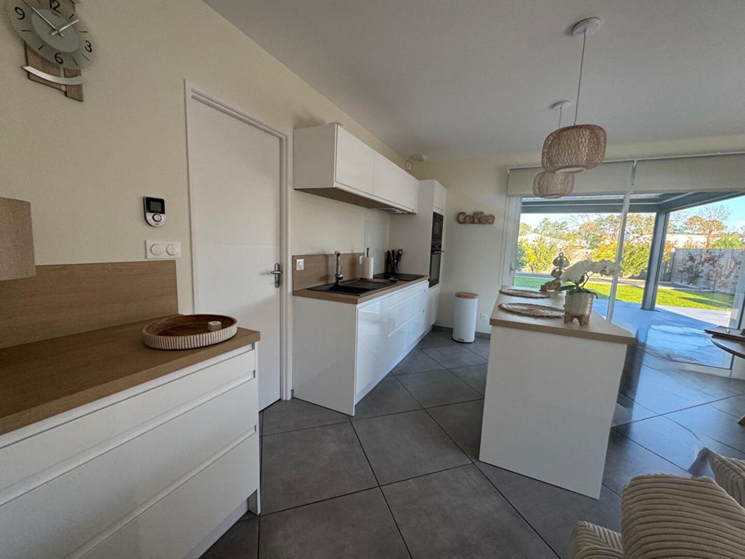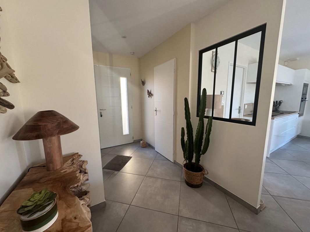 Cette superbe maison contemporaine à la décoration soignée, achevée en 2022 (sous assurance dommage/ouvrage), se compose d'une entrée avec placard, une pièce de vie lumineuse comprenant un séjour, une salle à manger, une cuisine US équipée, une arrière cuisine aménagée à l'image de la cuisine (avec point d'eau) et un wc séparé.