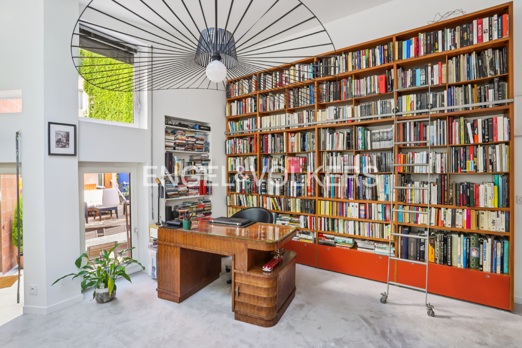 Au RDC : double séjour de plain-pied avec la terrasse - jardin et différents niveaux créant des volumes atypiques et différents espaces de vie - salon avec cheminée - salle à manger - bureau-bibliothèque - un autre espace bureau, une cuisine dinatoire équipée ouvrant sur la terrasse et sur le séjour, une chambre parentale possiblement indépendante (ancien studio) avec accès terrasse, sa salle de bain et WC séparés
