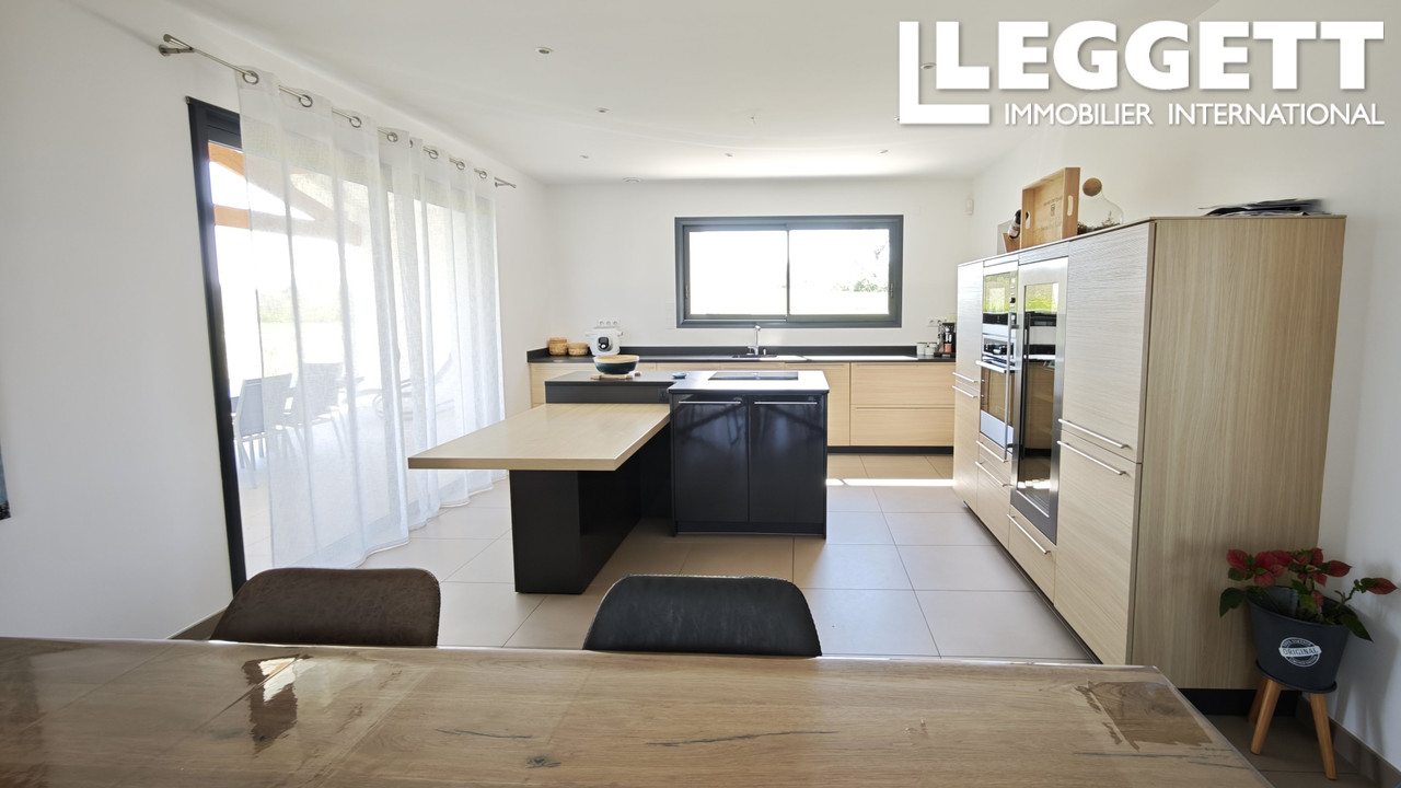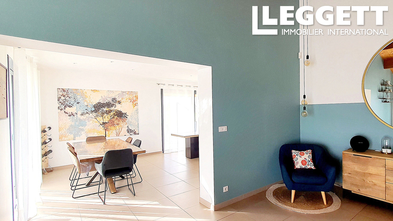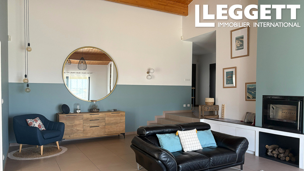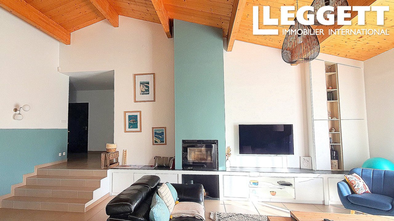 Salon déplafonné de 40 m² avec cheminée insert, cuisine équipée avec espace repas et cellier, 4 chambres, 1 bureau, salle de bains et salle d'eau communicante. Prestations haut de gamme : Chauffage au sol (PAC) et cheminée insert, baies vitrées à galandage, volets roulants connectés, aspiration centralisée, arrosage automatique alimenté par le puits, alarme, fibre, rangements sur-mesure.