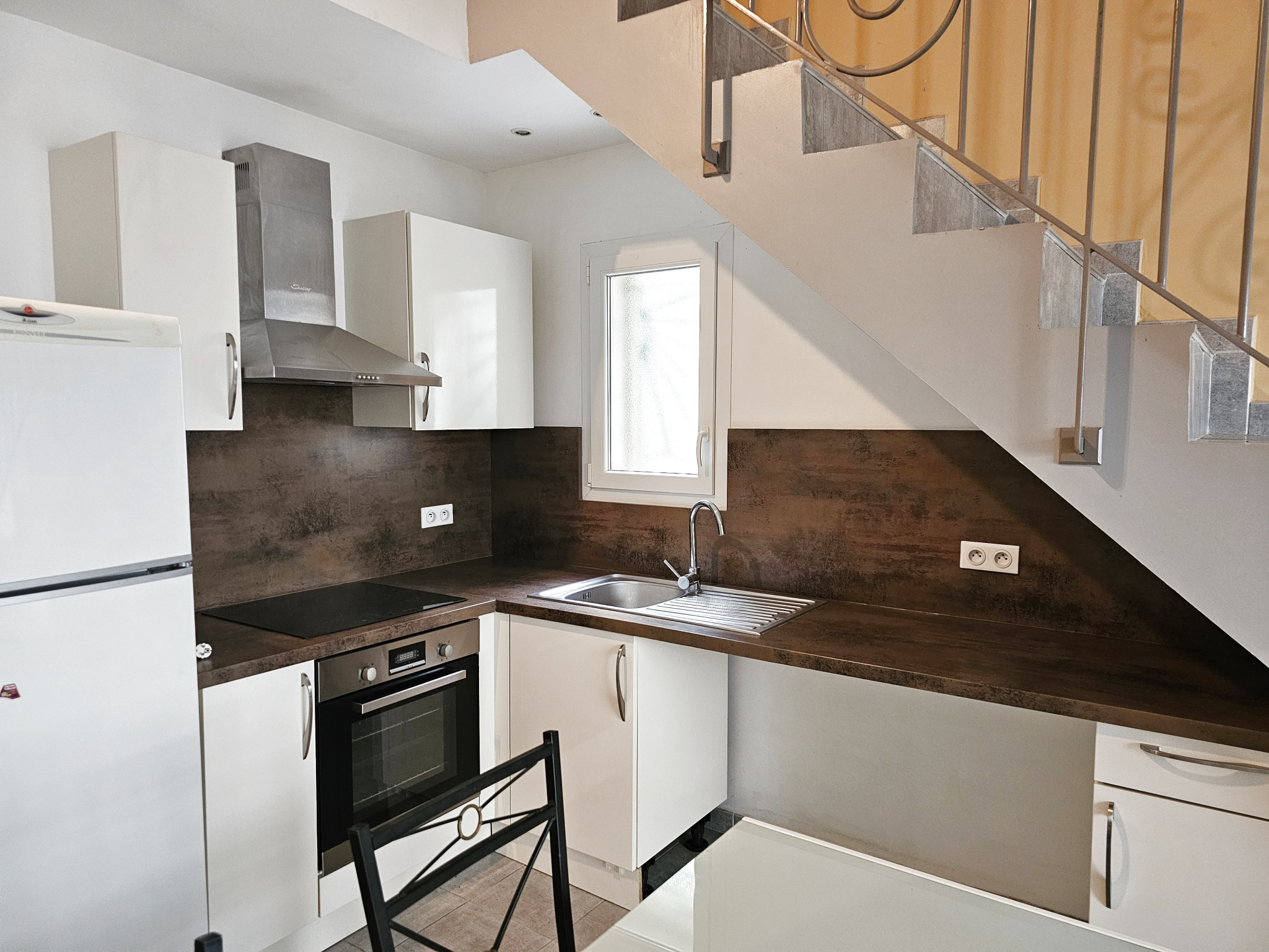 Elle se compose au rez-de-chaussée d'une entrée, une pièce de vie avec cuisine en partie équipée, une chambre, une salle d'eau avec WC, terrasse et jardin.. A l'étage une mezzanine et une chambre avec placard.