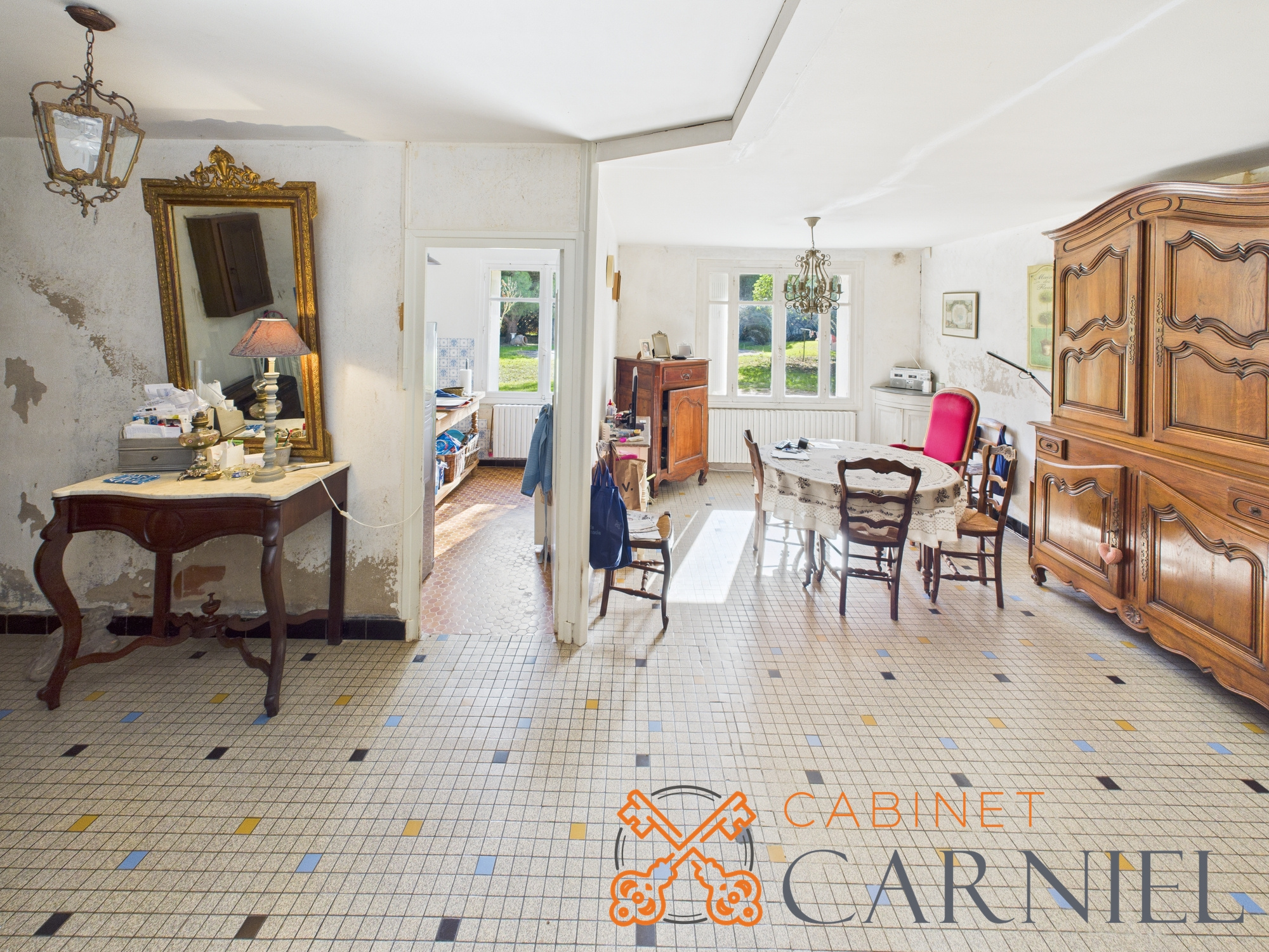 Rez-de-chaussée à rénover : Entrée, Cuisine, Salle à manger, Salon avec murs en pierre apparente et cheminée, 2 chambres, Salle de bains avec WC
