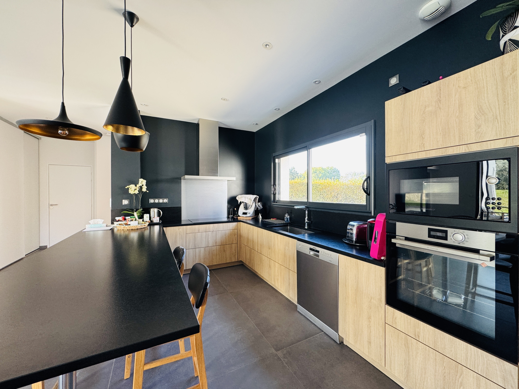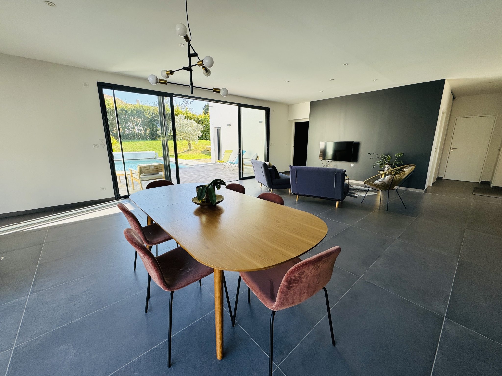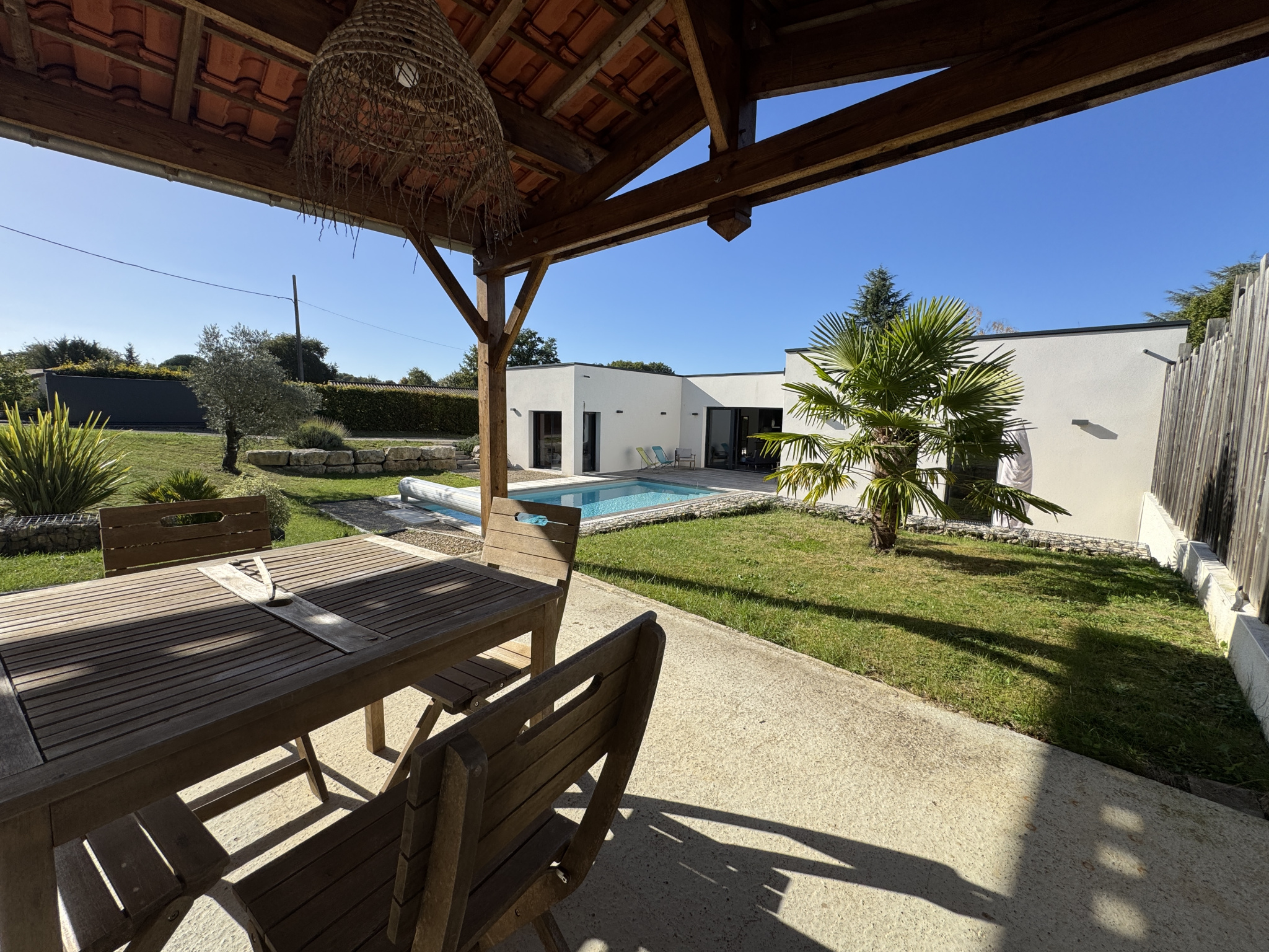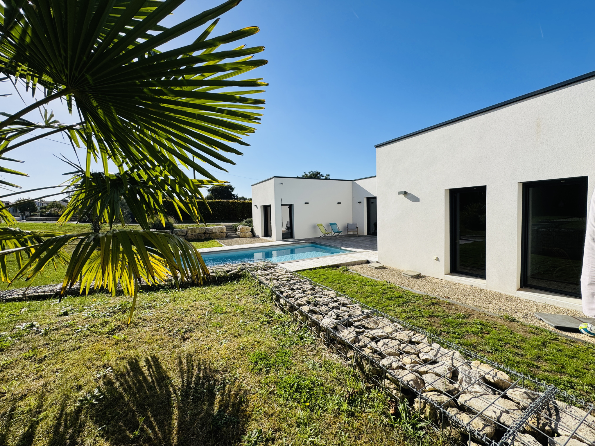 À vendre, aux portes de Poitiers, superbe maison contemporaine de plain-pied construite en 2018 en utilisant des matériaux de qualité. La maison offre 160 m2 habitables sur une parcelle de 1 300 m2 arborée et entièrement clôturée, avec piscine enterrée et terrasse en bois. Lumineuse et fonctionnelle, elle se compose d'une grande pièce de vie traversante avec cuisine ouverte aménagée et équipée, quatre chambres dont une suite parentale avec dressing et salle d'eau, une seconde salle d'eau, deux WC, un dressing indépendant, une buanderie avec accès extérieur, ainsi qu'un garage double avec mezzanine de rangement. Un poolhouse et une cuisine d'été couverte (à finaliser) complètent ce bien aux prestations de qualité. Un cadre calme et verdoyant, à quelques minutes de Poitiers centre.