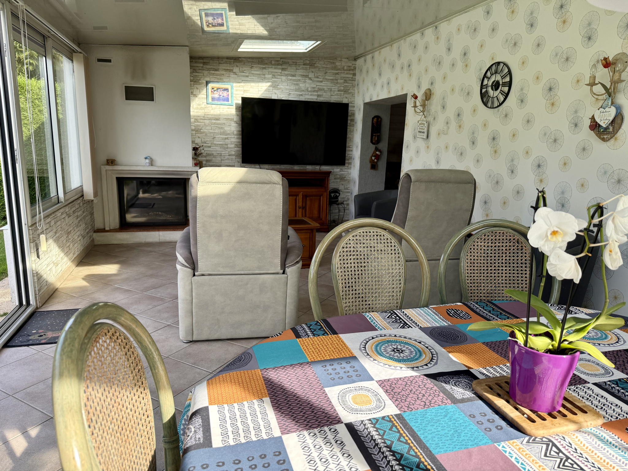 La maison d'environ 90m2 habitables vous offre: une cuisine aménagée, une salle à manger (possibilité de créer une 3ème chambre à la place), une belle véranda avec vue sur le jardin et la piscine, salle de douche et WC. A l'étage: palier, chambre, chambre avec salle de douche et WC. Cellier-buanderie.