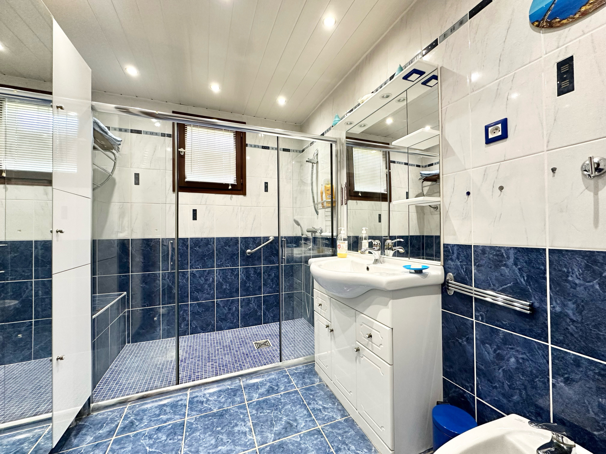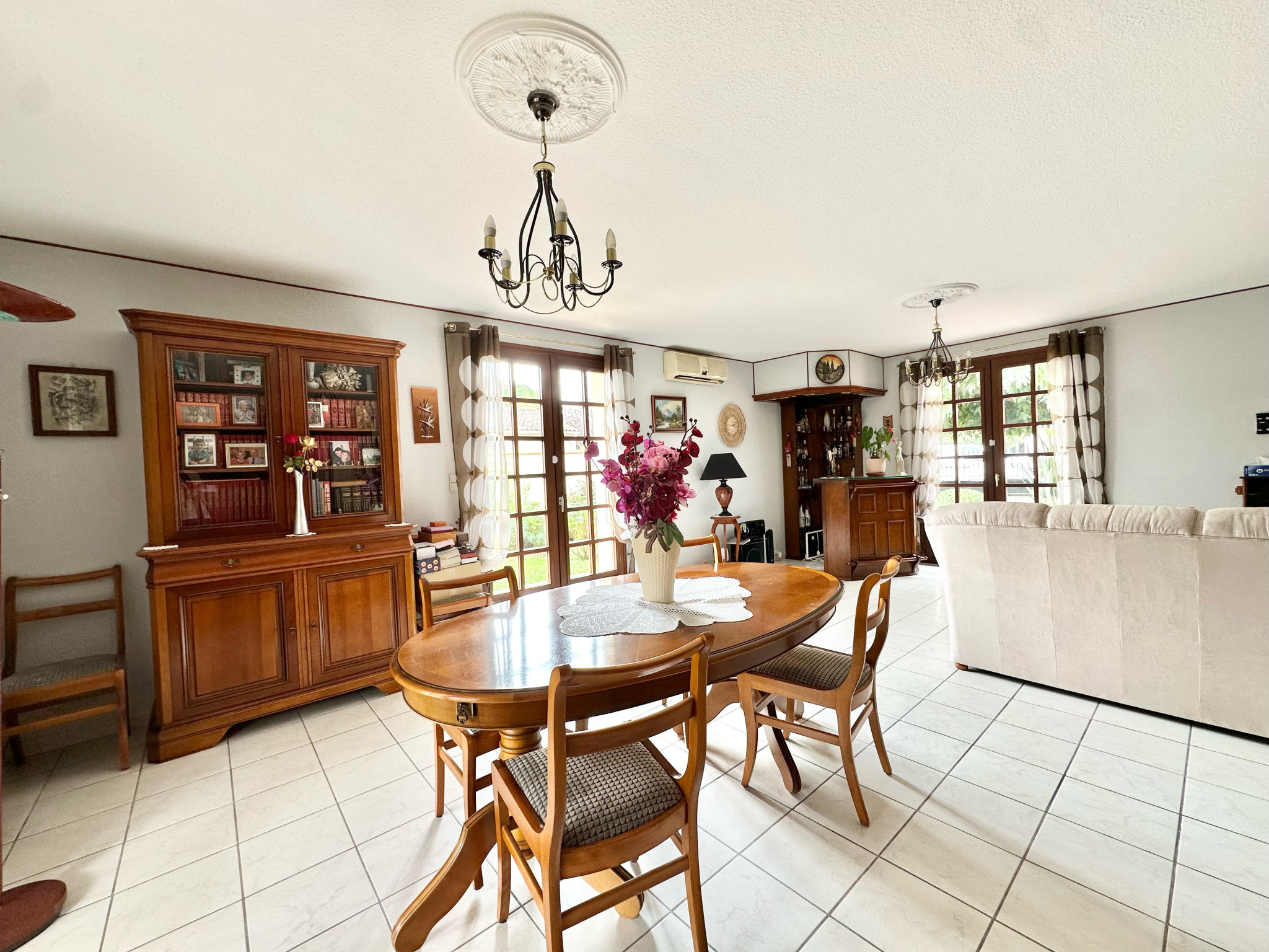 La maison, de construction traditionnelle, dispose d'une spacieuse pièce de vie de 42 m2 lumineuse triple exposition, équipée d'une climatisation réversible pour un confort optimal toute l'année. Elle donne accès à deux terrasses. La cuisine séparée est entièrement aménagée et équipée. La partie nuit comprend trois chambres, une salle d'eau, des toilettes suspendues séparées avec placard ainsi qu'un cellier.