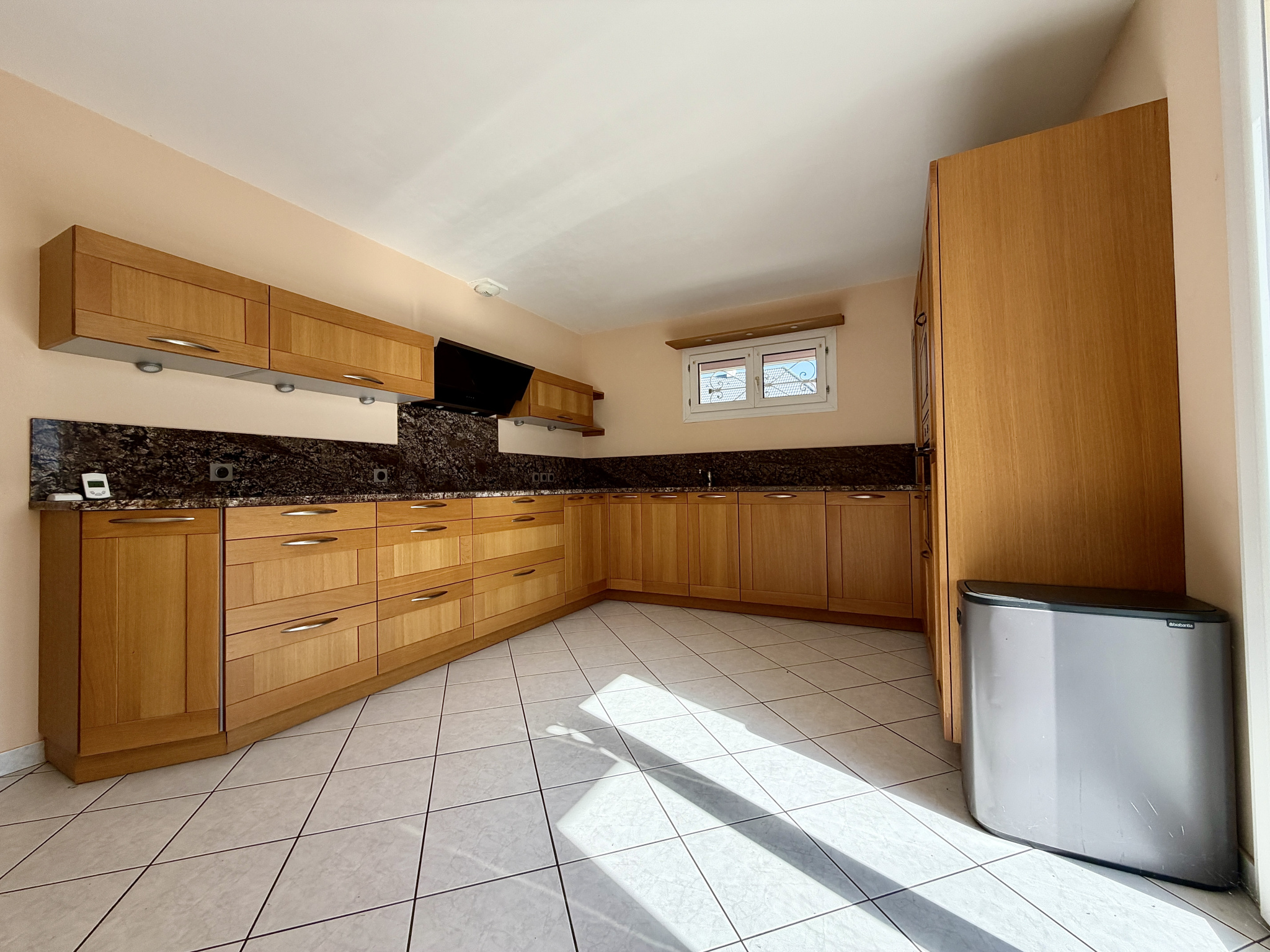 Cuisine de la marque Teisseire avec portes en chêne massif et plan de travail en granit, dalle en béton armé de 74m2 recouverte de dalles en granit, traitement de toit complet haut de gamme climate cooler, porte d'entrée de la marque internorm et fenêtres triple vitrage...
