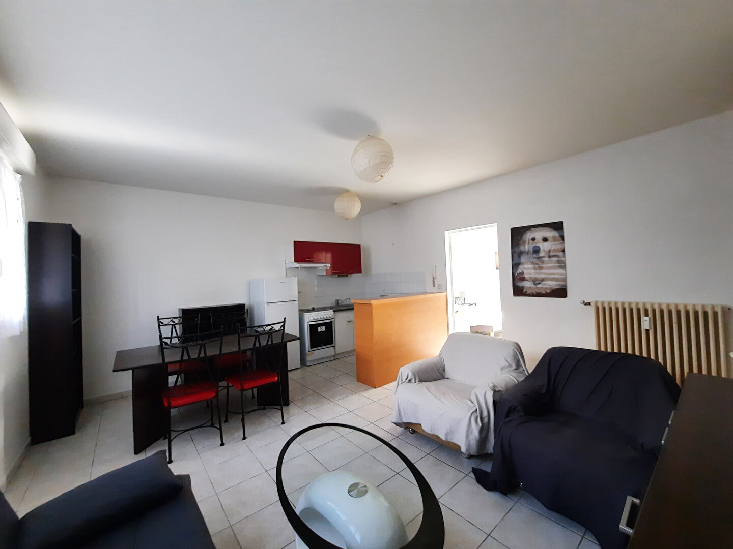 Appartement de type 2 comprenant : une entrée, une cuisine aménagée et équipé ouverte sur un séjour exposée ouest, une grande chambre avec placard, une salle de bains et un wc séparé.