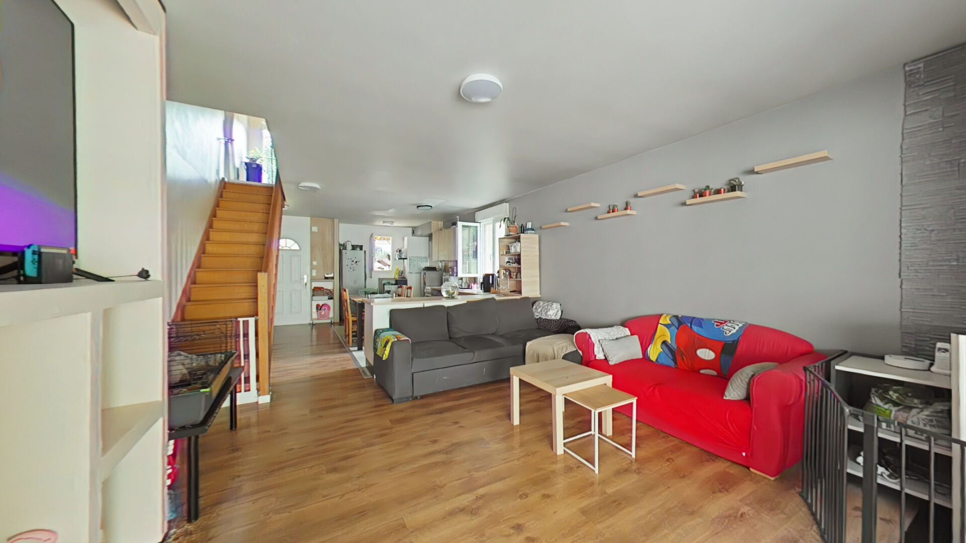 Une belle cuisine aménagée équipée ouverte sur une pièce de vie lumineuse équipée d'un poéle à granulés, une chambre, une salle de bain, un wc, ainsi qu'une grande baie vitrée donnant l'accès à un jardin chaleureux et sans vis à vis, idéal pour se détendre.